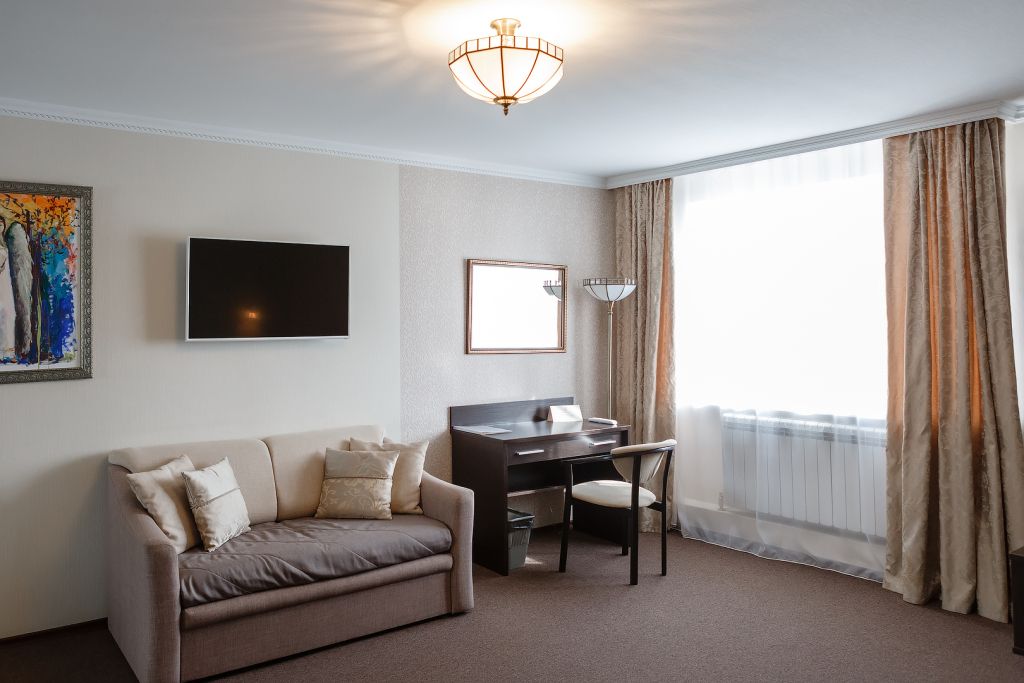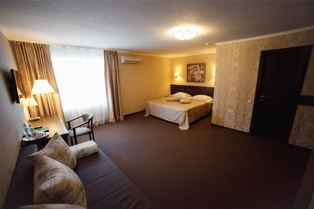 Двухкомнатный номер, двуспальная кровать, сауна, джакузи, ТВ, кондиционер, телефон, сейф, мини холодильник, душевая кабина, фен, косметические принадлежности, два сан. узла. Вид на Волгу Дети до 6-ти лет на основном месте принимаются бесплатно (за питание доп. плата). Детская кроватка по запросу предоставляется комплиментарноУслуги и удобства