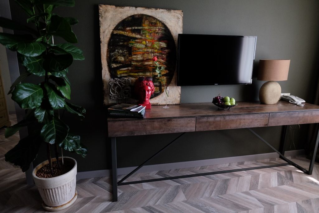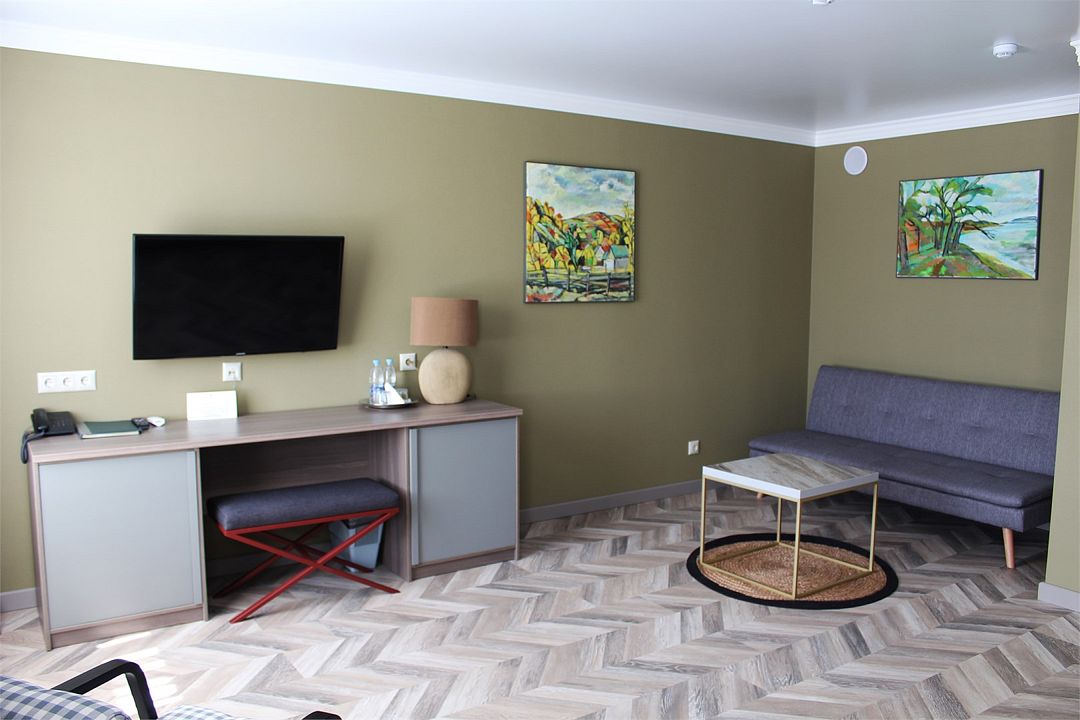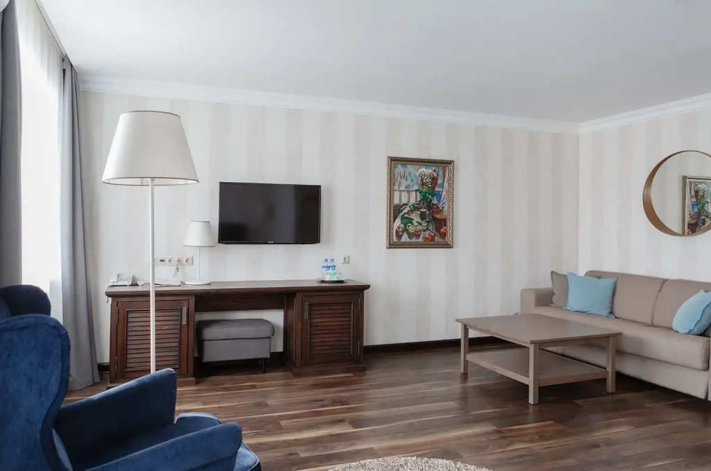 два телевизора, кабельное телевидение, Wi-Fi, телефон, кондиционер, светильник, настольные лампы, фен, электронные замки, обогреватель, душевая кабина, ванная с джакузи, санузел, дополнительный санузел, банные принадлежности, халаты, тапочки, гигиенические средства, косметические средства, сауна, двуспальная кровать, ортопедический матрас, диван, кресла, стулья, шкаф для одежды, вешалки, журнальный столик, письменный стол, зеркало, комод, две комнаты, чайный набор, набор посуды, сейф, чайник, раковина, питьевая вода, гостиная зона, отопление, вид на реку, кресло, ламинат, туалетные средства, раскладной диван, москитная сетка, вид на горы, джакузи, чайная станция, бутилированная вода, можно с питомцамиВ гостиничном номере
