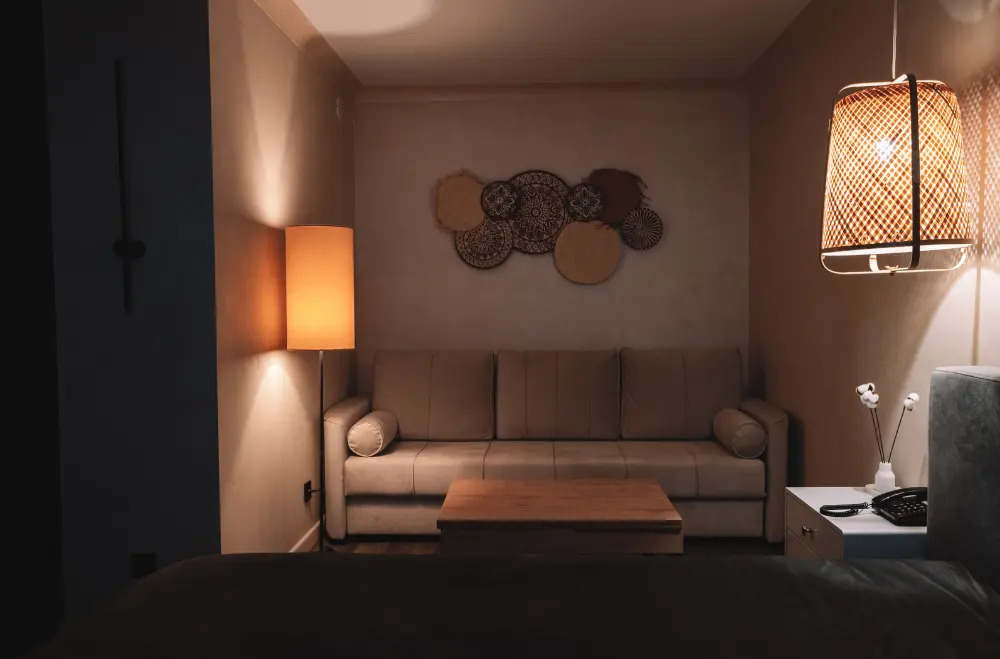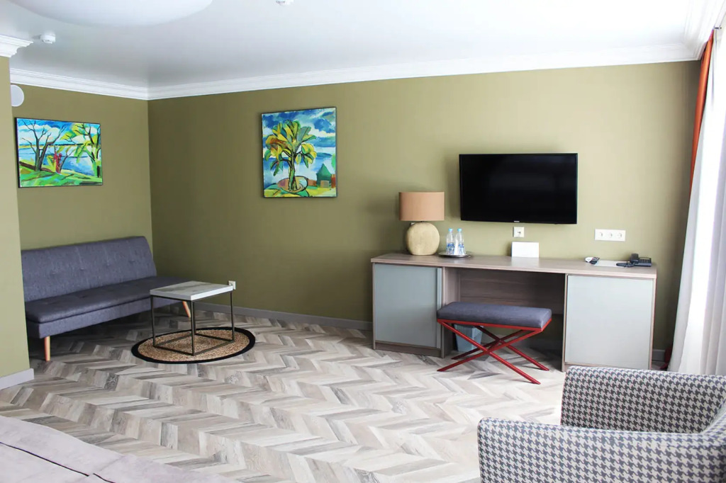 кабельное телевидение, Wi-Fi, телефон, кондиционер, светильник, настольные лампы, фен, обогреватель, душевая кабина, санузел, банные принадлежности, халаты, тапочки, косметические средства, две односпальные или большая двуспальная кровать, диван, стулья, шкаф для одежды, вешалки, журнальный столик, зеркало, чайный набор, сейф, раковина, косметическое зеркало, отопление, кулер на этаже, кресло, вид во двор, ламинат, вид на парк, телевизор с плоским экраном, москитная сетка, номер для некурящих, пуфик, рабочий стол, чайная станция, бутилированная вода, можно с питомцами, лежанка, мискаВ гостиничном номере