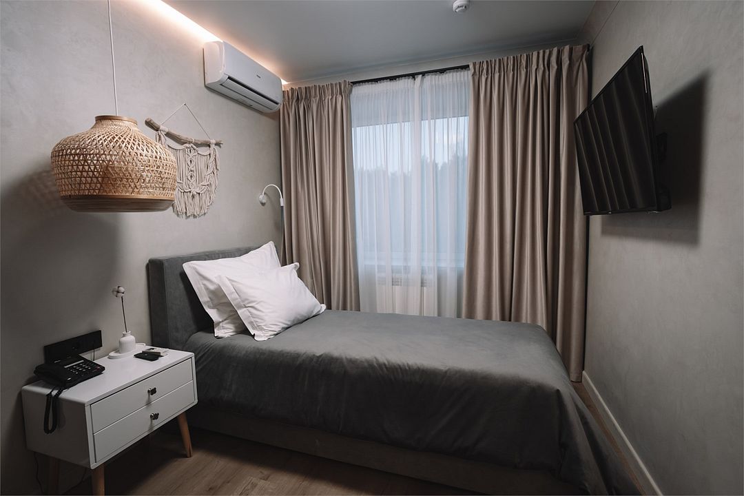 Wi-Fi, телефон, холодильник, кондиционер, светильник, фен, обогреватель, душевая кабина, санузел, банные принадлежности, халаты, тапочки, косметические средства, односпальная кровать, шкаф для одежды, вешалки, зеркало, мини-бар, чайный набор, сейф, чайник, раковина, косметическое зеркало, отопление, кулер на этаже, телевизор с плоским экраном, москитная сетка, номер для некурящих, вид на лес, чайная станция, бутилированная вода, можно с питомцамиВ гостиничном номере