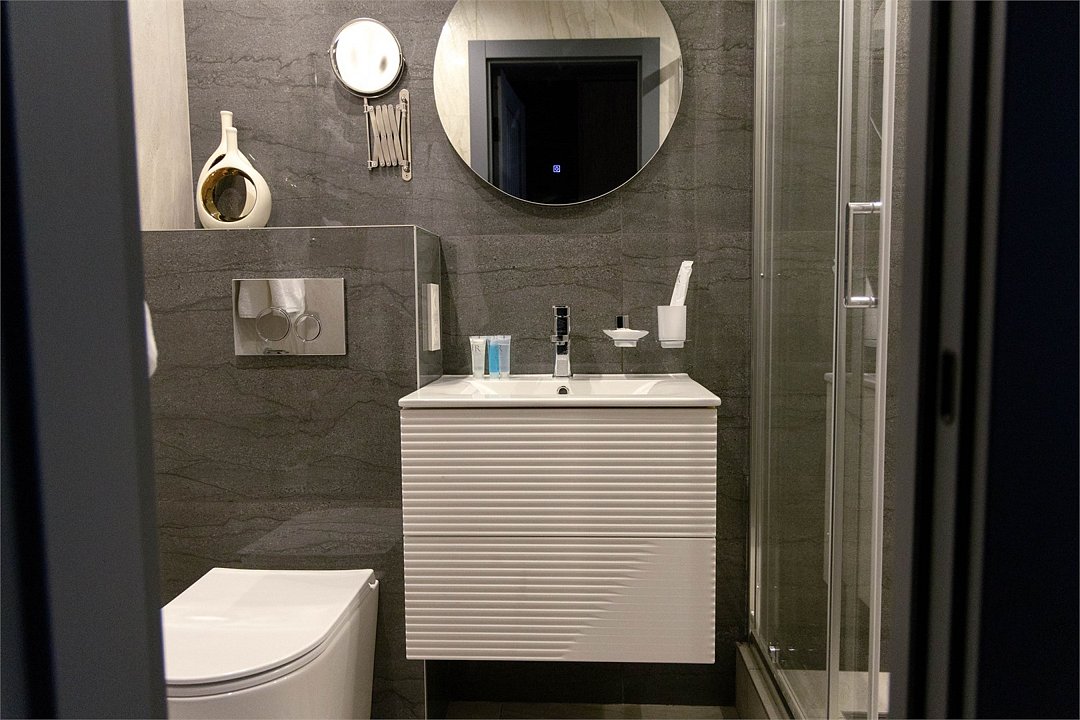 Брызги из душевой летят в центр санузла слегка. Унитаз на высоте для ребенка лет 5-7, а зеркало с увеличением на высоте для баскетболиста. Мягко говоря очень удивила такая расстановка элементов как для маленького жирафа.