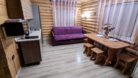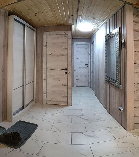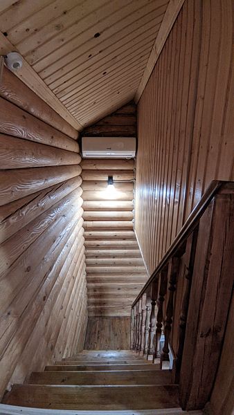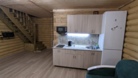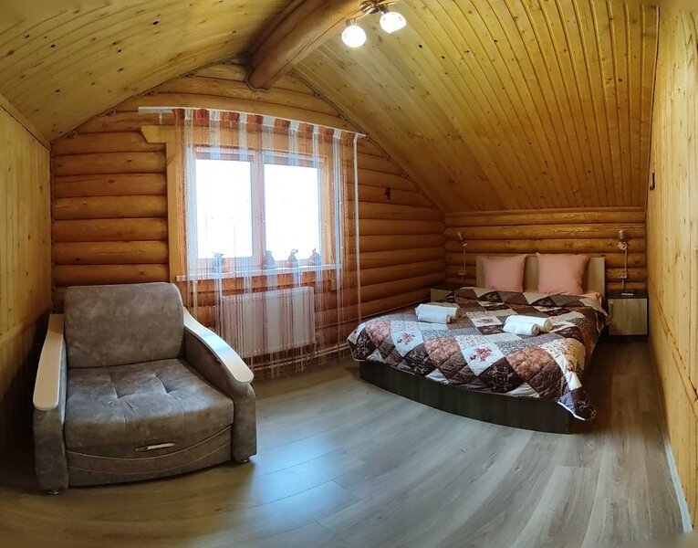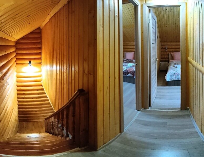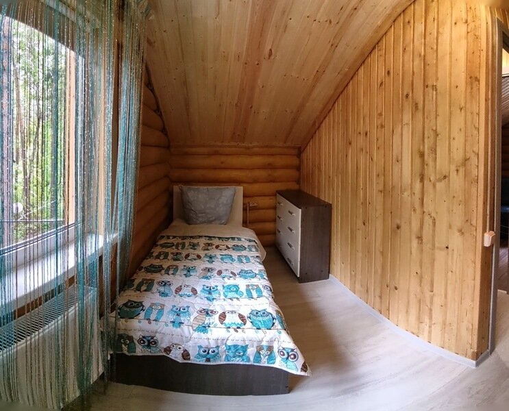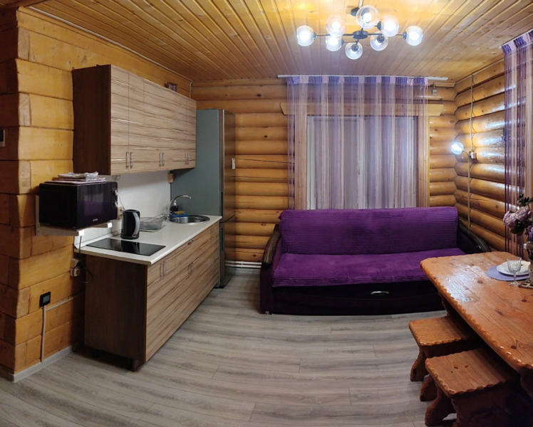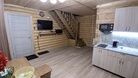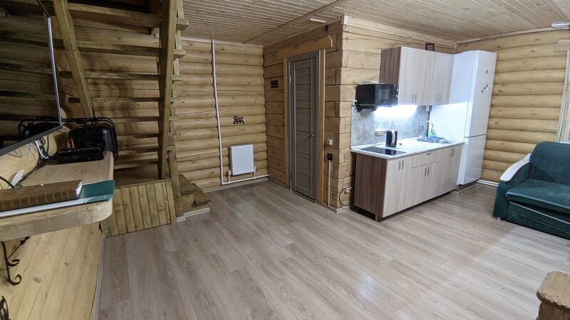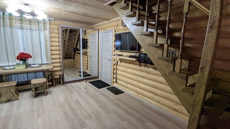 На втором этаже оборудованы две спальные комнаты, а на первом этаже вы найдёте кухню-гостиную с холодильником, техникой, набором посуды и санузел с душевой кабиной. В обеденной зоне на первом этаже размещён удобный большой диван для всей компании и шкаф-купе для хранения вещей. Есть Wi-Fi и спутниковое ТВ НТВ+.