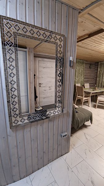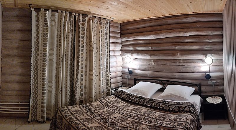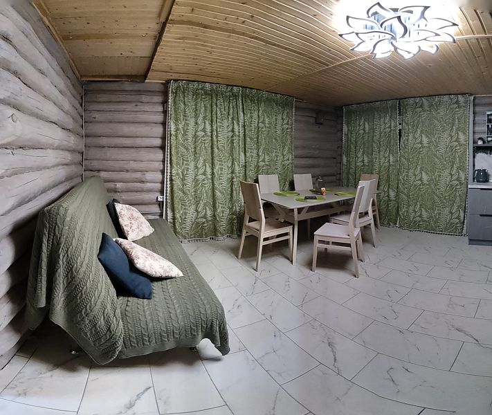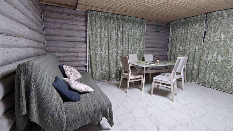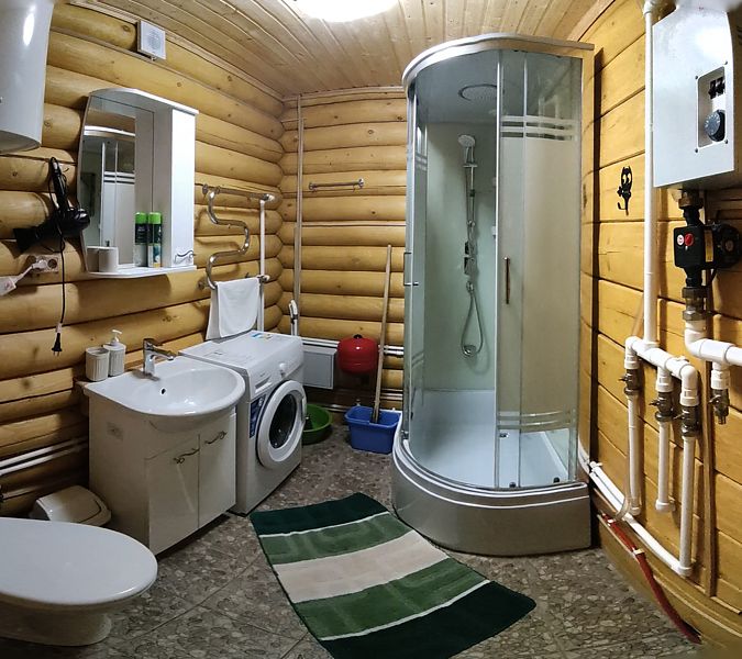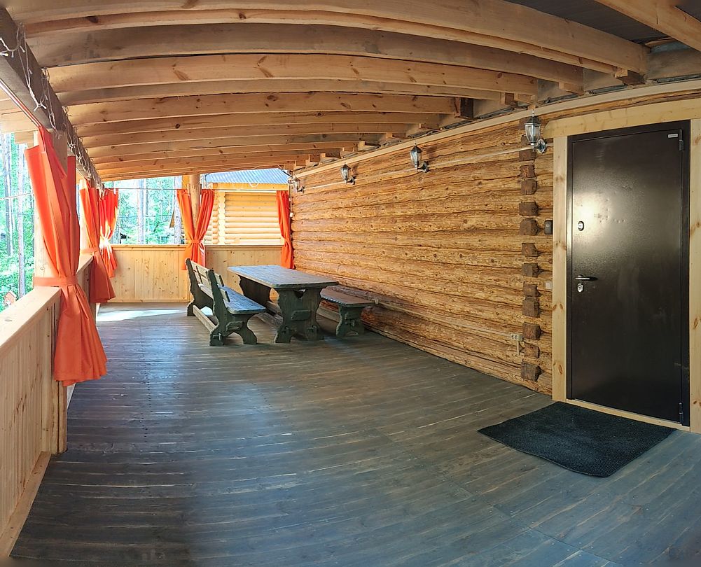 В доме 6 спальных мест: два на диване, два на двуспальной кровати и две одноместные кровати. Санузел оборудован душевой кабиной и зеркалом с подсветкой. На большой веранде (4 на 9 метров) установлен деревянный стол со скамейками.