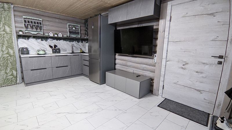 На кухне есть вся необходимая техника и разнообразная посуда. Также имеется шкаф-купе и часы с кукушкой.
