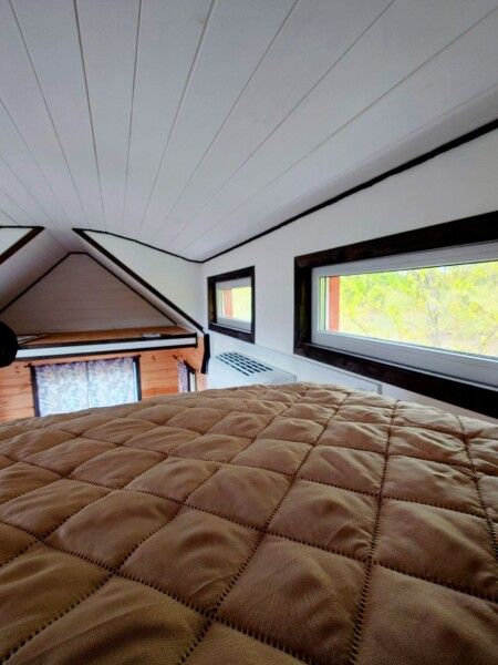 В доме есть небольшая кухня, холодильник, столовая посуда и посуда для готовки, 2 кровати шириной 160 см. (одна из них находится на втором свете), душ, туалет, стол, стулья.