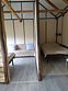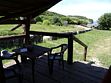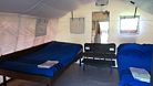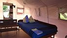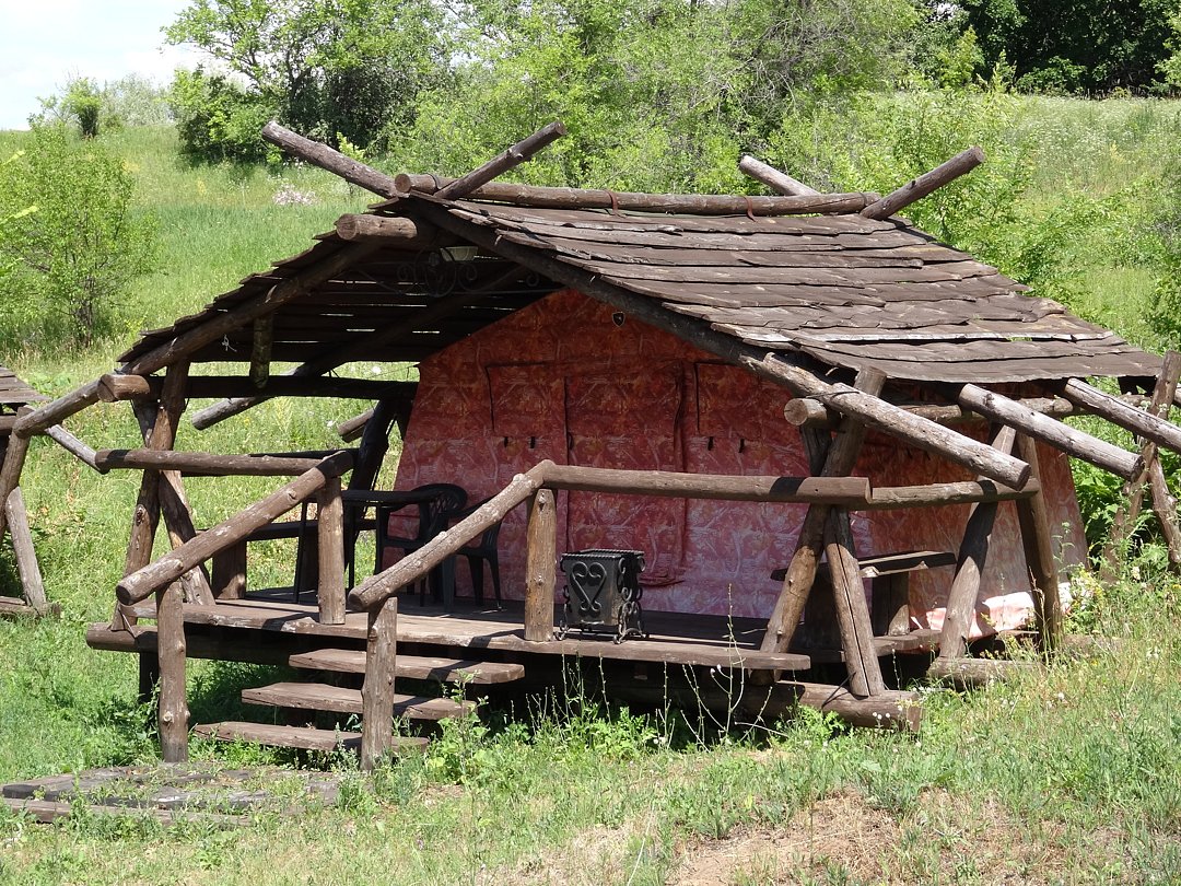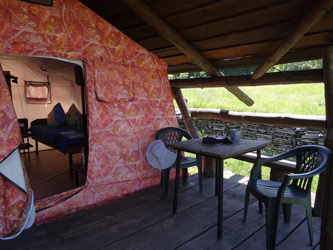 Двухпологовая палатка, надежно защищенная от дождя и полуденного солнца деревянным навесом и козырьком обеспечивающим комфортное пребывание на веранде.