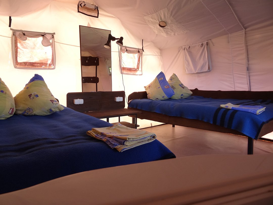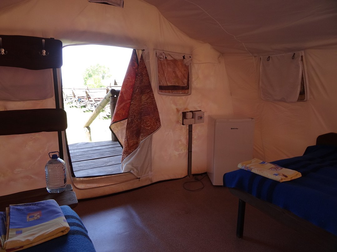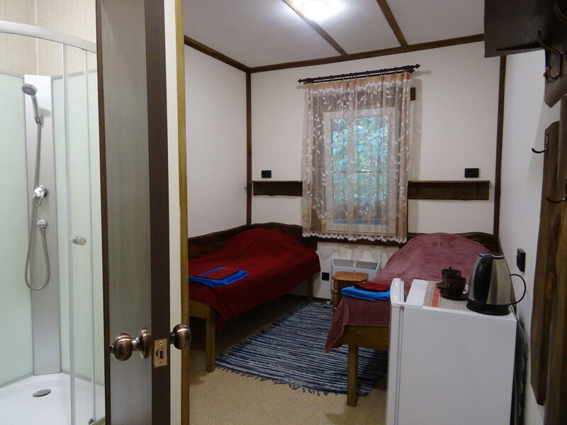 Внутри оснащена обогревателем, многослойными окнами для проветривания, имеется внутреннее и внешнее освещение, чайник, мини холодильник, для вашего удобства вешалка для одежды, зеркало, ну и конечно две полутраспальные кровати для здорового сна. При Бунгало находятся туалет и душевые кабинки общего пользования.
