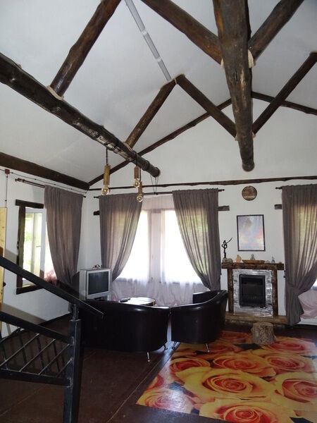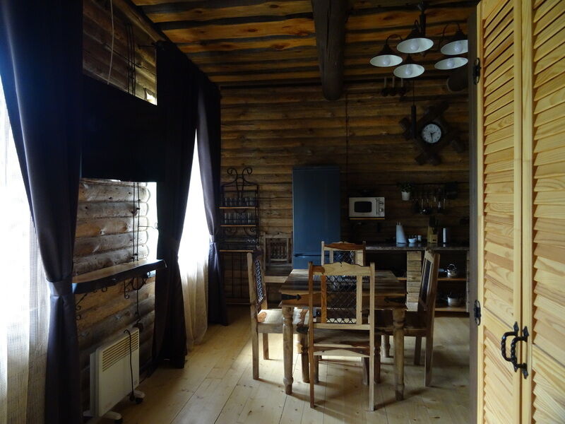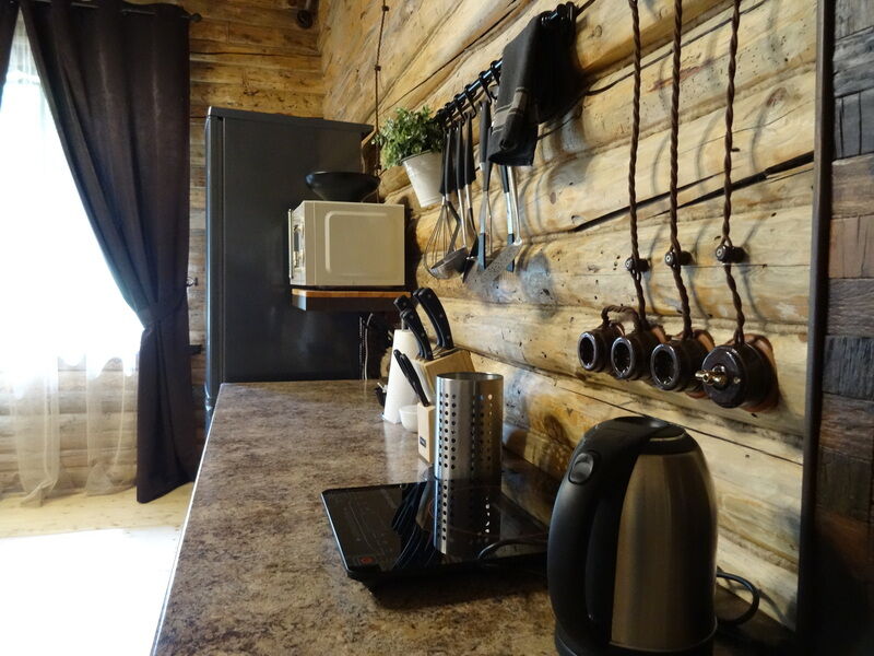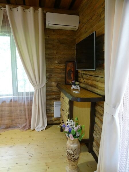 В доме 3 комнаты - спальня, комната отдыха, кухня-гостиная. Удобства: душевая кабина, туалет, кондиционер, телевизор, холодильник, чайник, индукционная плита, посуда, микроволновая печь. Баня на дровах внутри домика, можно заказать отдельно. Постели застелены, есть полотенца, мыло, шампунь, гель для душа.