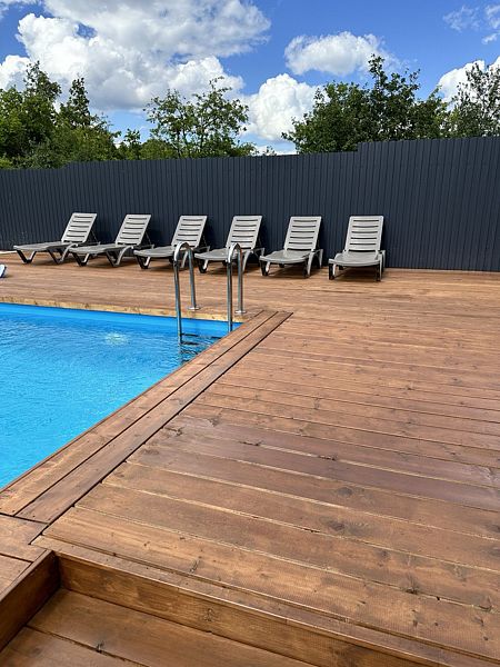Тип бассейна: открытый бассейнРядом с бассейном: шезлонгиРазмеры: 3 x 6 мПериод работы: летний сезонБассейн функционирует с апреля по октябрь с учетом среднесуточной температуры.