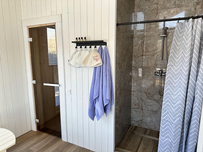 2 санузла и 2 душа (один душ находится в зоне сауны), свежие полотенца для каждого гостя, гели для душа, шампунь, ватные палочки и диски, мицелярная вода и крем для рук.