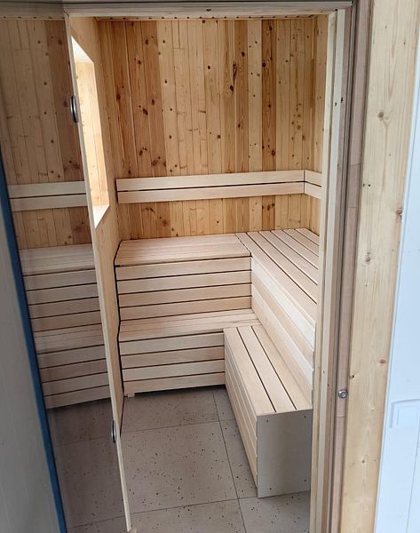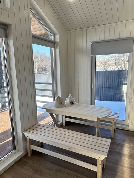 Сауна находится прямо в доме: не нужно одеваться и куда-то идти. Сауна, комната отдыха с небольшим столом и душ все расположено в одной зоне.