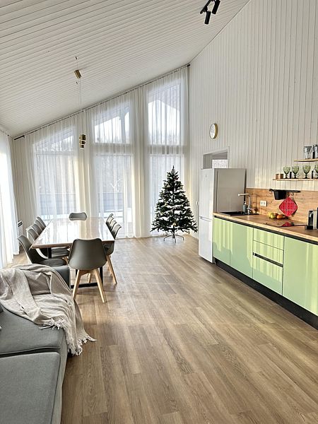 Атмосферная просторная кухня-гостиная, с большим обеденным столом и панорамным видом позволит наслаждаться завтраком, обедом или праздничным ужином.