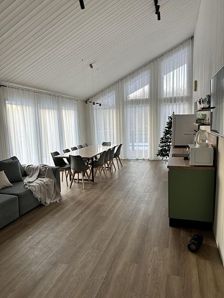Просторная и атмосферная кухня-гостиная с большим обеденным столом и панорамным видом сделает завтраки, обеды и ужины особенными.