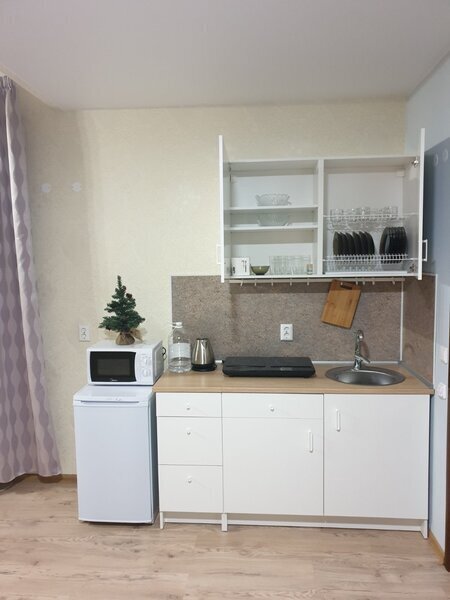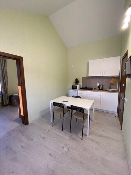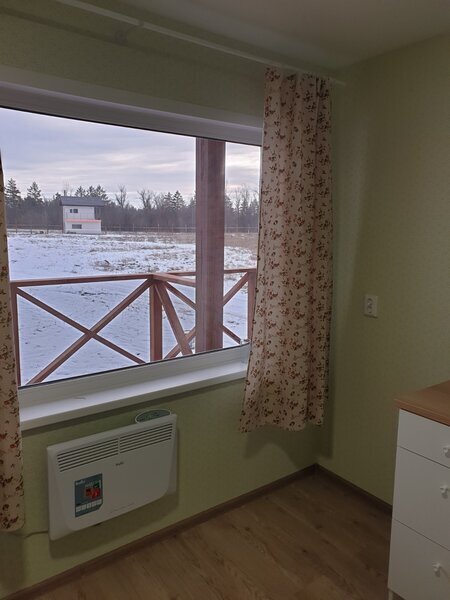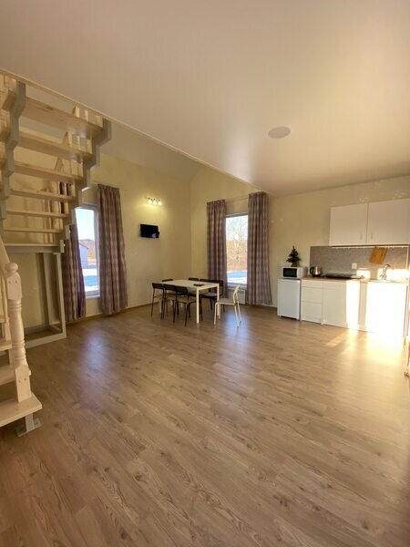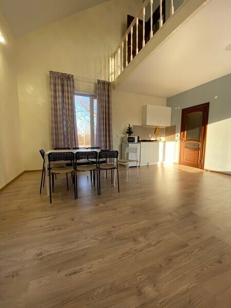 На первом этаже коттеджа расположена кухонная зона со всей необходимой техникой (холодильник, СВЧ, плита, электрочайник, посуда на 6 персон, столовые приборы, кастрюля, сковорода, тарелки двух видов, бокалы) , стол, стулья, телевизор и два раскладывающихся дивана. Комната с полутороспальной кроватью.