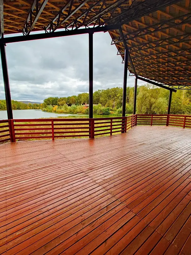 Органическая архитектура, с красивым видом на озеро и горы. У веранды есть достаточно большая площадка для организации регистрации или других активностей.