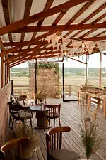 Веранда состоит из трех частей, крытая часть, с открывающимися мягкими окнами, открытая площадка для фотосессий, диджея и других задумок, открытая площадка для расширения посадки или отдельного места отдыха.