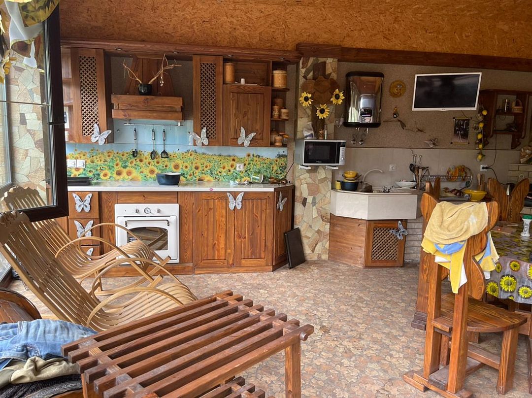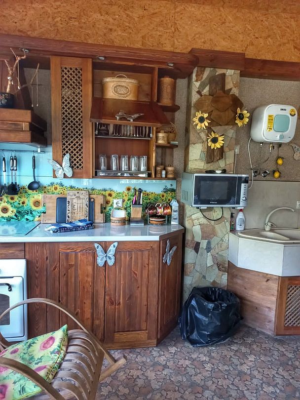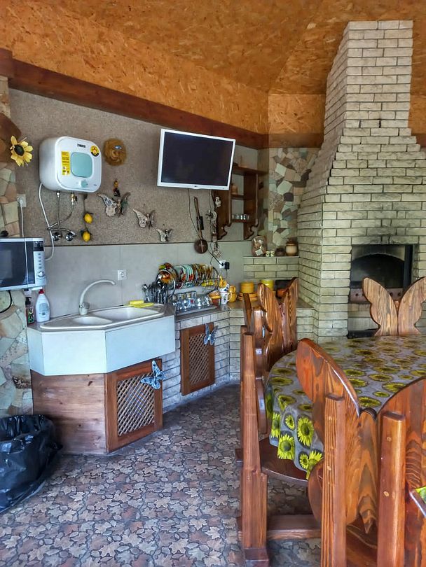 Есть печка, плита, духовка, большой стол, в печке есть место под казан, под решетки.
