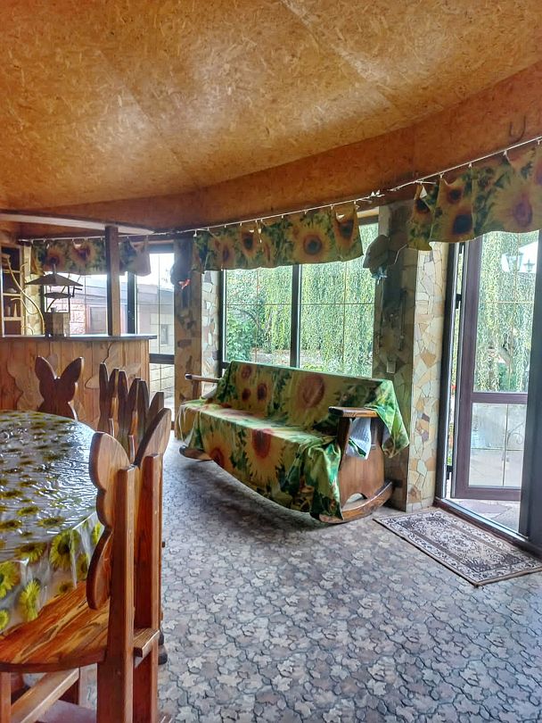 В доме на 2 этаже огромная комната с дизайнерской кроватью, двумя телевизорами, зимний сад с двуспальной кроватью, телевизором и рабочим местом.