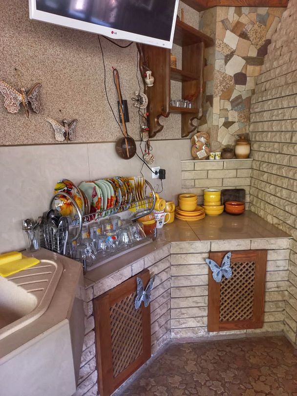 На 1 этаже кухня, санузел с ванной-джакузи, комната с 2 двуспальными кроватями и еще одна комната (винная) с спальным местом (диваном в подвальном помещении).