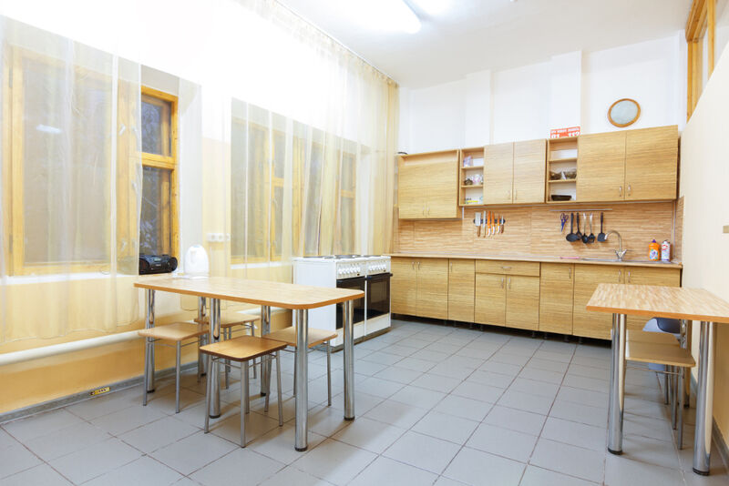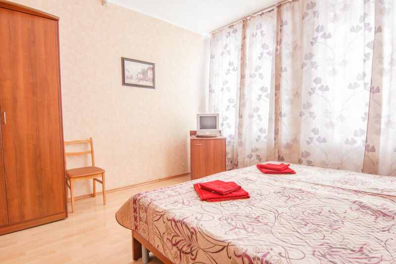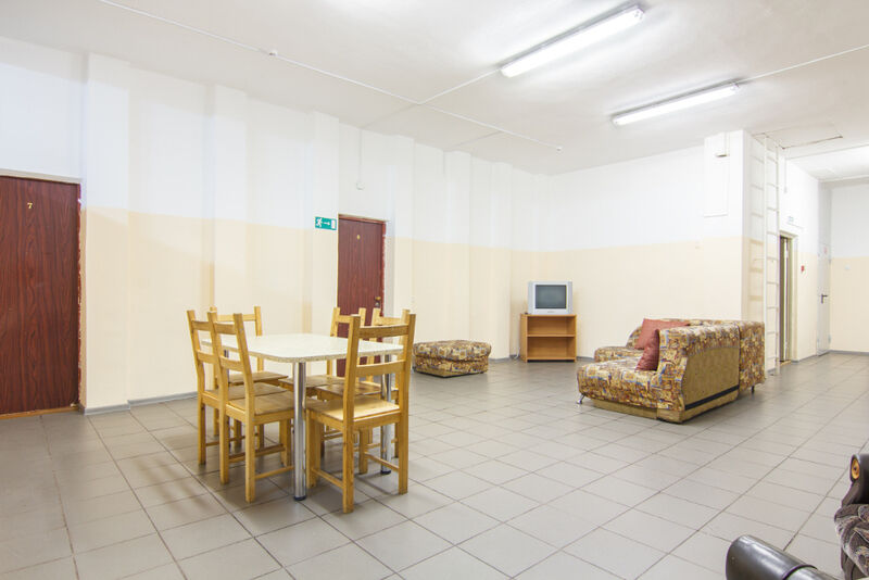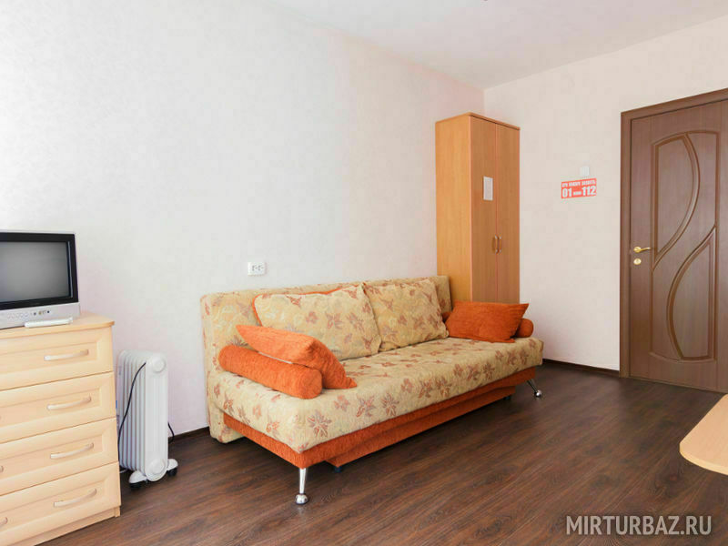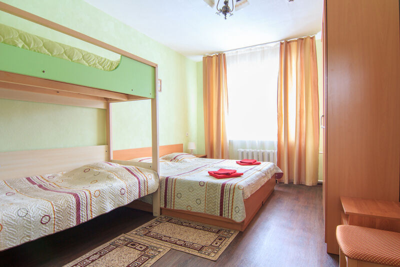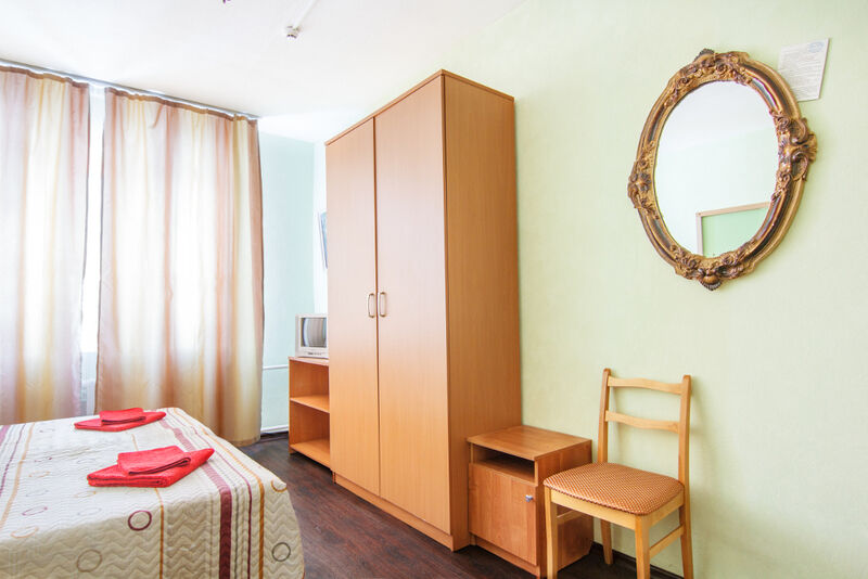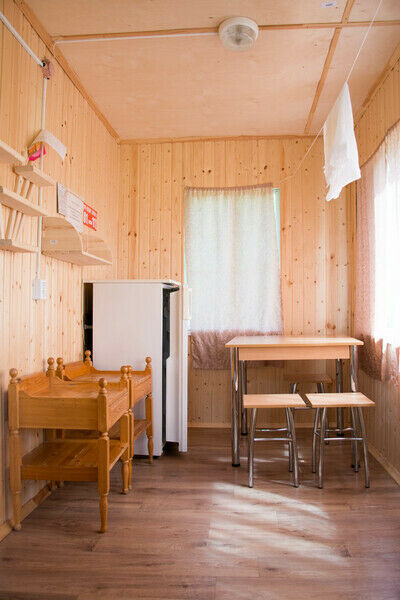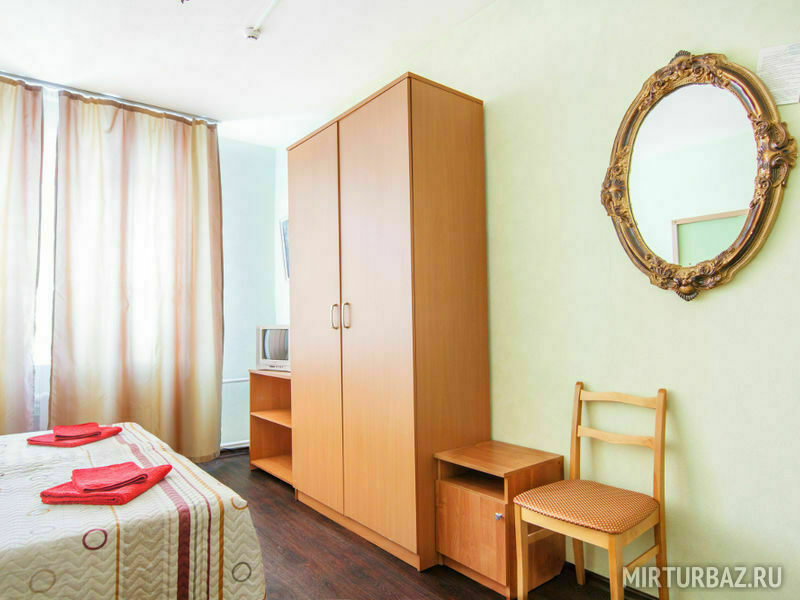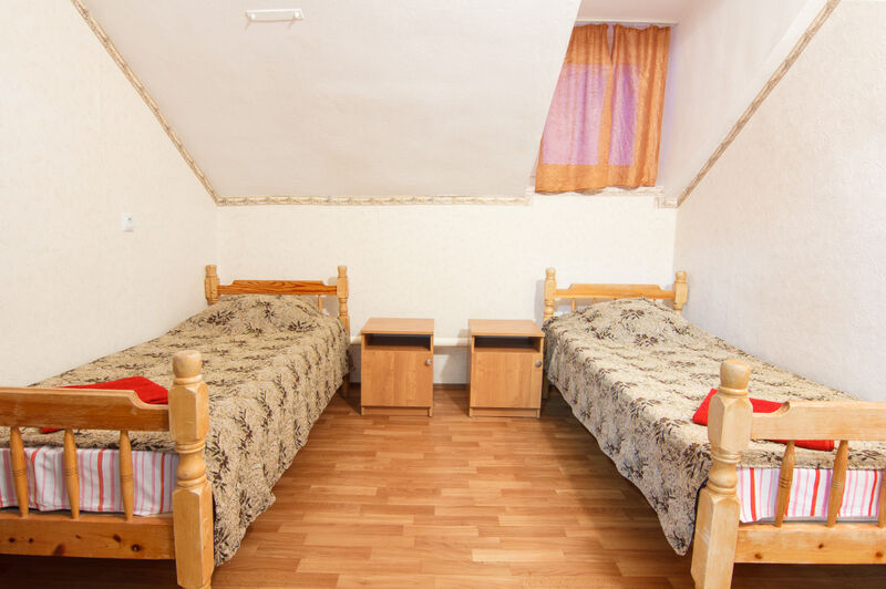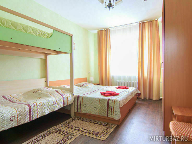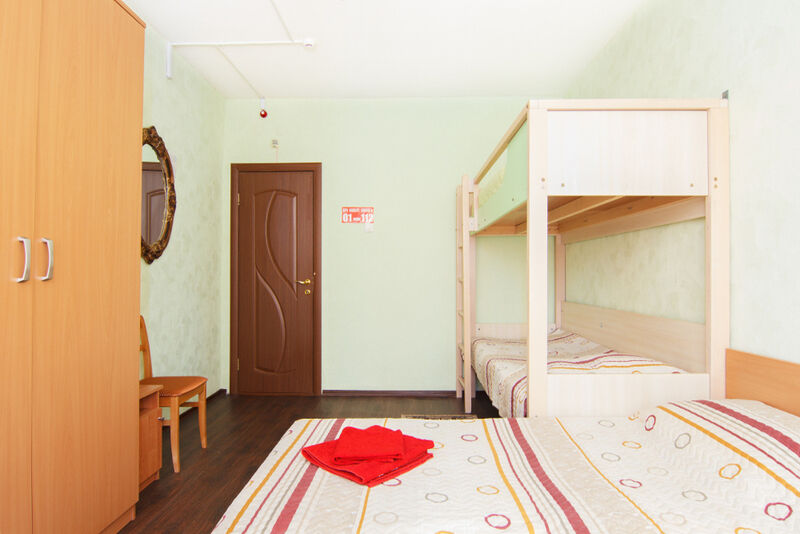 Однокомнатный номер. Две односпальные кровати, одна двухъярусная кровать, шкаф, тумбочка, стул, телевизор. Душевая кабина и туалет за пределами номера.