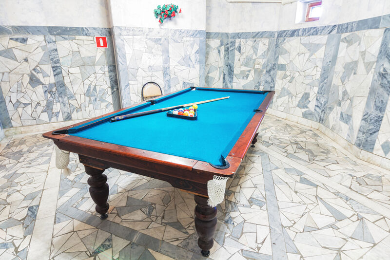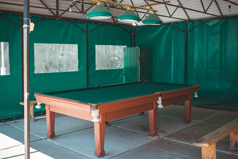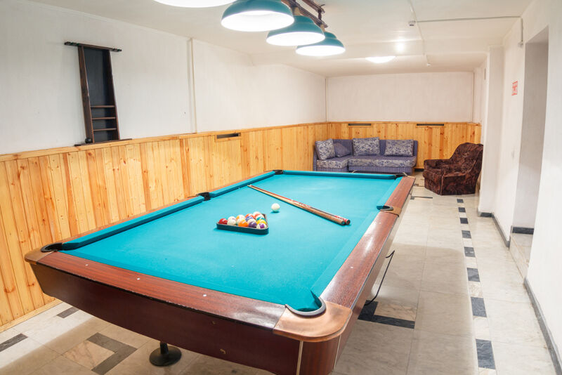 Кухня - кухонный гарнитур, холодильник, электрический чайник, электрическая плита, посуда для приготовления и сервировки пищи. На цокольном этаже находится бильярдная.