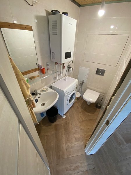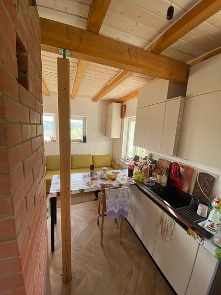 Первый этаж: зал совмещенный с кухней (посудомоечная машина, газовая плита, дровяная печь-мангал-камин, баня, душевая, туалет, стиральная машинка)