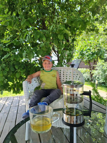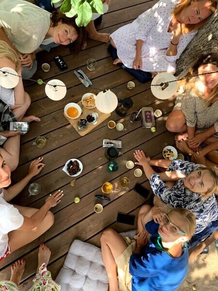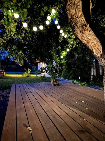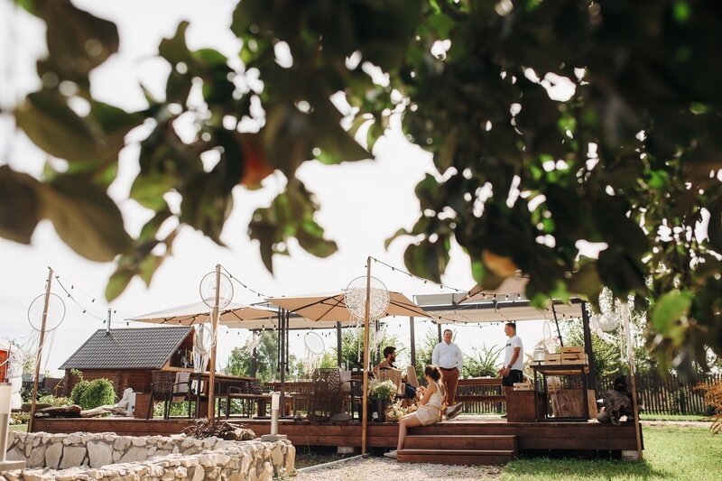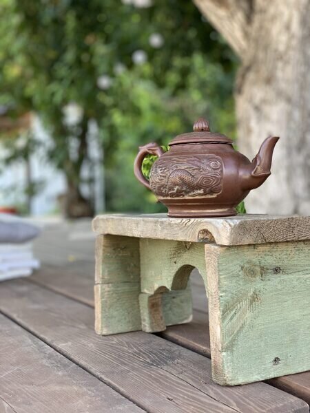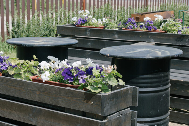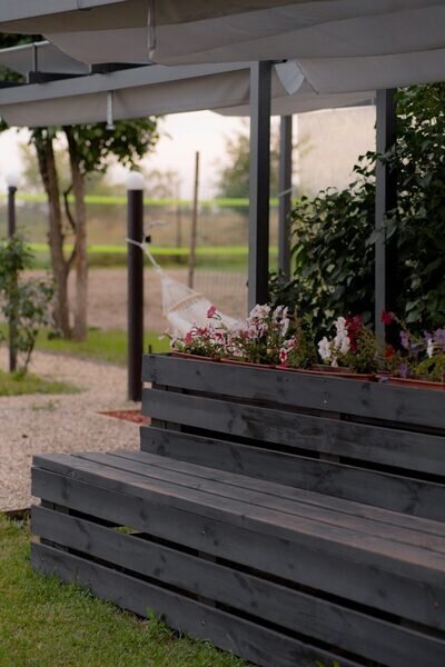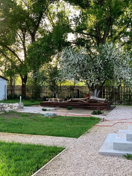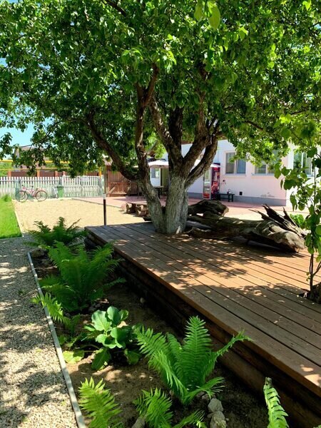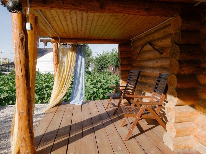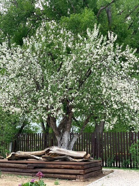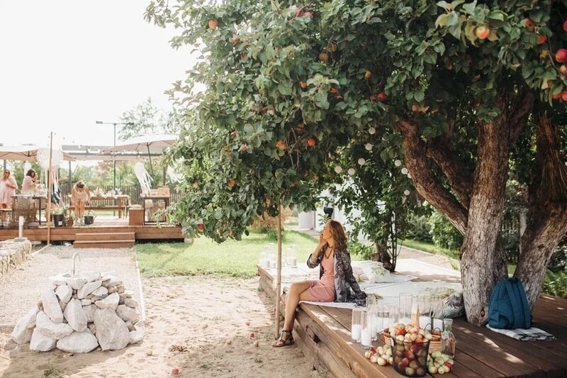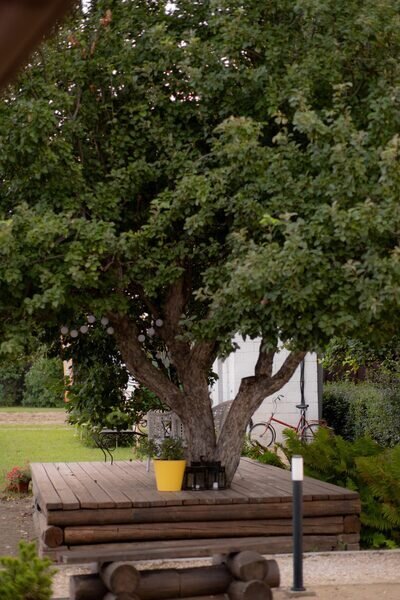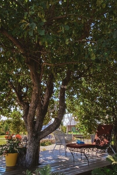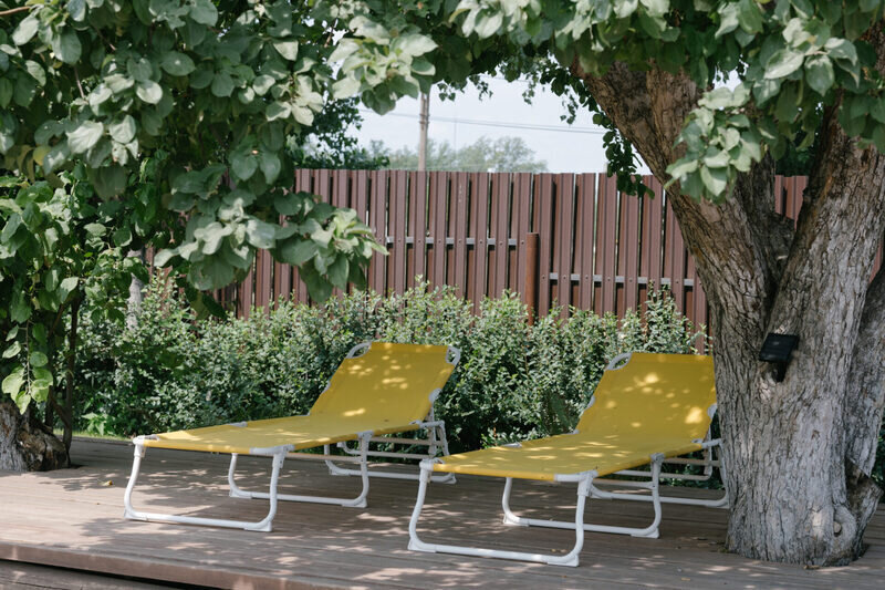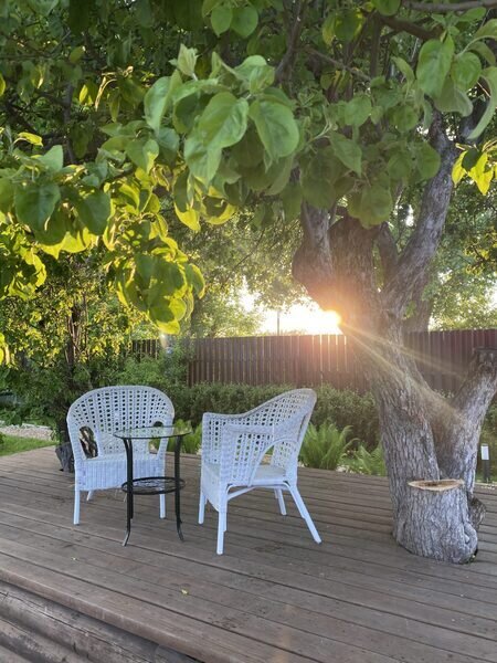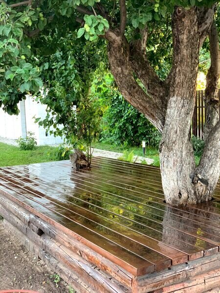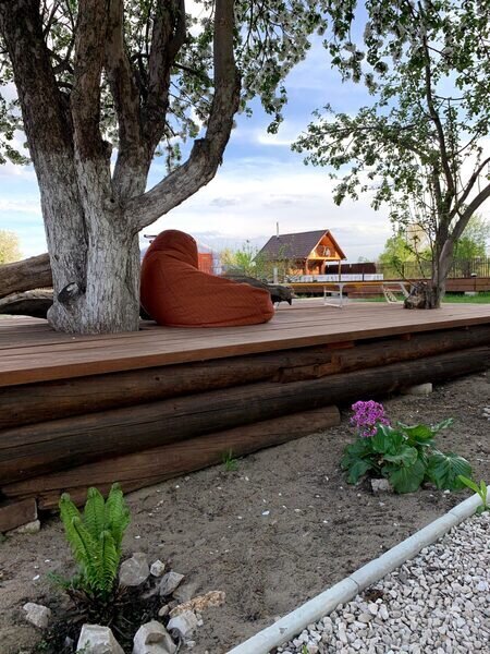 Комфортная деревянная площадка под яблоней — отличное место, чтобы просто посидеть на свежем воздухе в тишине и насладиться любимой книгой или обособленно наблюдать за происходящим на территории.