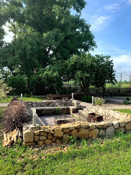 Рядом с яблоней есть специально оборудованное место для приготовления шашлыков, рыбы или овощей на углях.