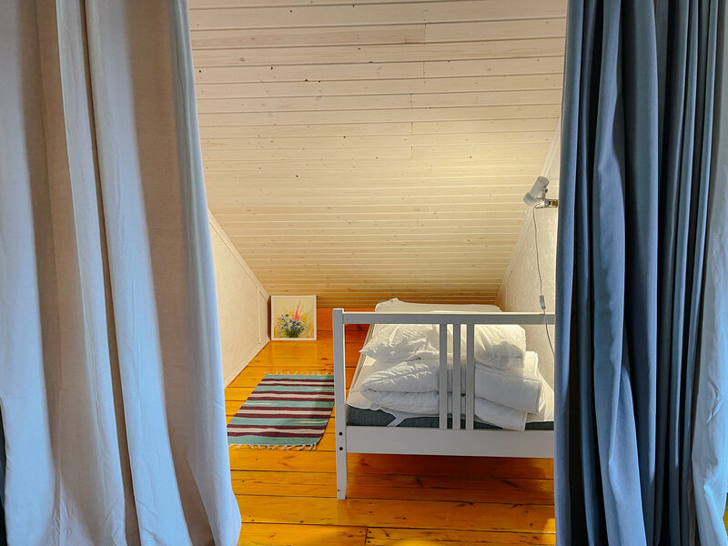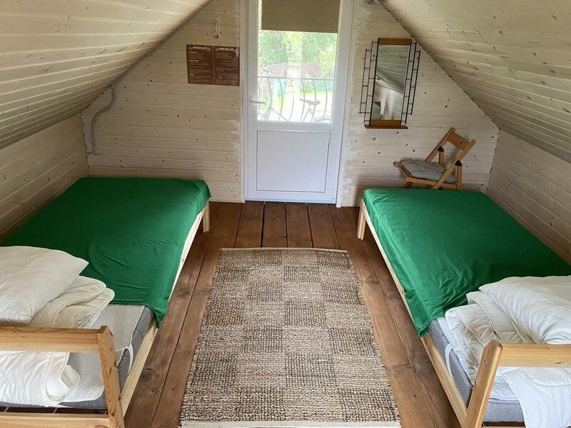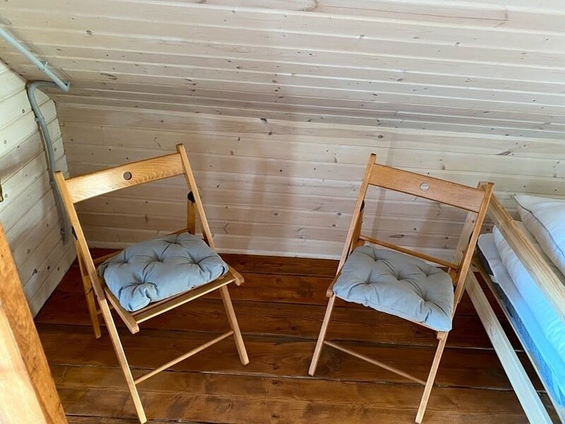 Комната хорошо проветривается, везде стоят москитные сетки, так что можно спокойно спать с открытыми дверьми в теплые ночи. Внутри две односпальные кровати, которые можно сдвинуть при необходимости. Для Вас готовим постельное белье, полотенца и питьевую воду. Удобства (умывальник, душ с горячей и холодной водой, туалет) прямо у входа на второй этаж баньки. В комнате есть свой набор посуды и чайник.