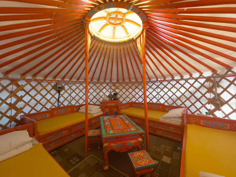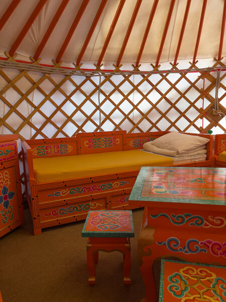 В юрте четыре кровати с традиционной росписью и стол с табуретами. Это отличный вариант для большой семьи или компании друзей.