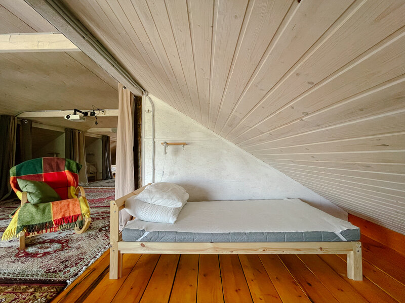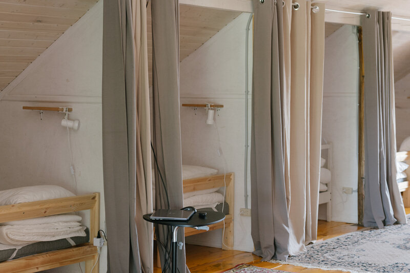 Есть кондиционер, стол для игр, низкий стол для чаепитий, интерьер располагает для вечерних разговоров по душам. Пространство окружает Вас теплотой и создает атмосферу дома. В то же время, у каждого жителя есть возможность уединиться в своем отсеке за плотной шторой. Для каждого предоставляется постельное белье и полотенце. На этаже есть удобства и душевая. Дополнительные душевые расположены прямо у входа в гостевую мансарду.