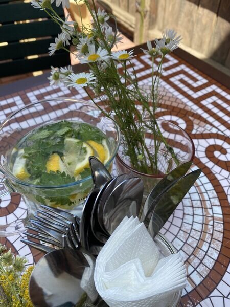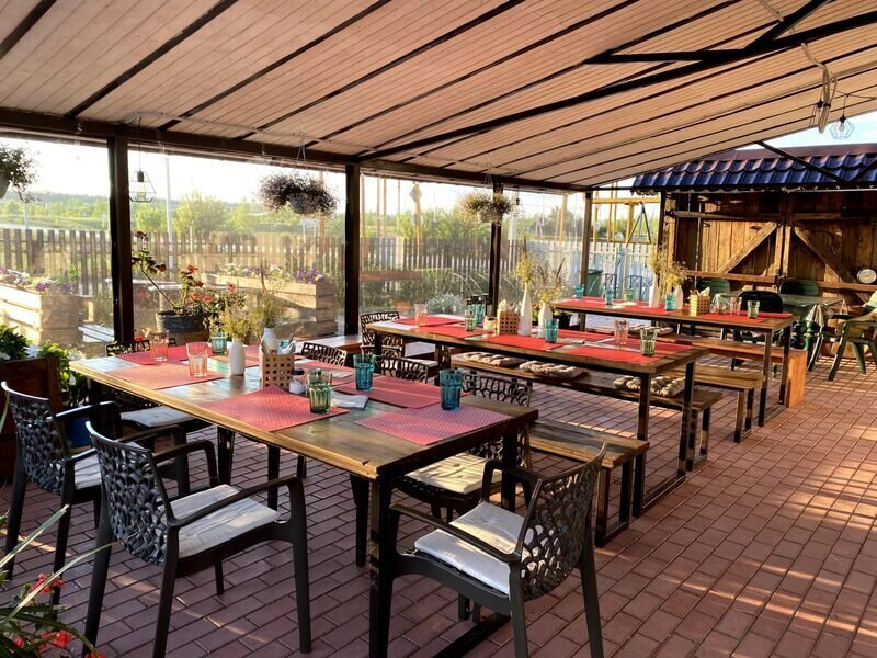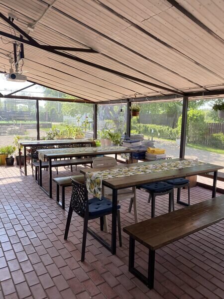 Здесь располагается 4 стола для компаний 8–10 человек. Общая вместимость при комфортной посадке составляет 32–40 мест.