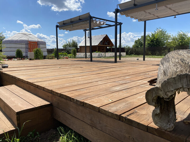 Также на территории имеется деревянная площадка площадью 48 квадратных метров для проведения групповых занятий йогой и других активностей.