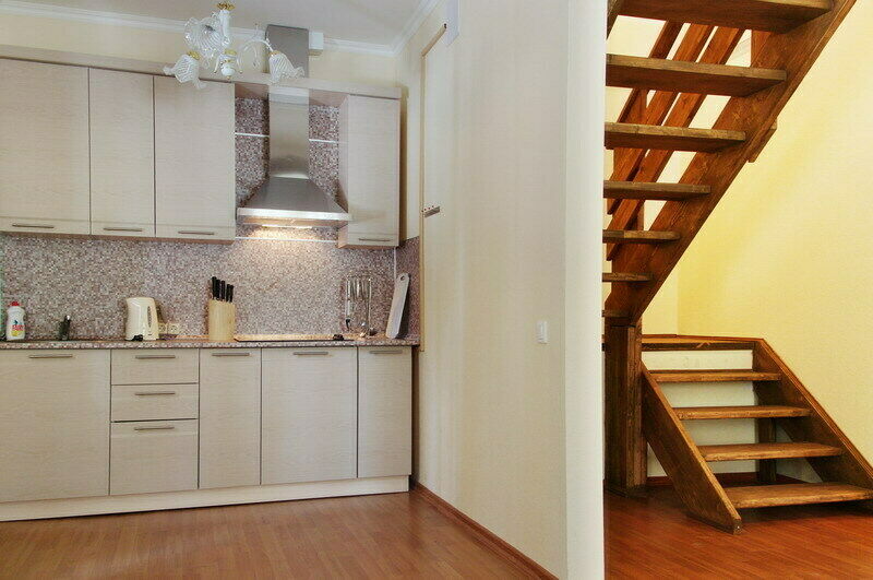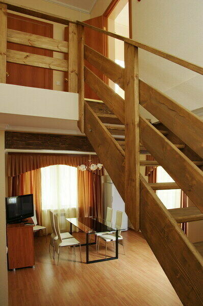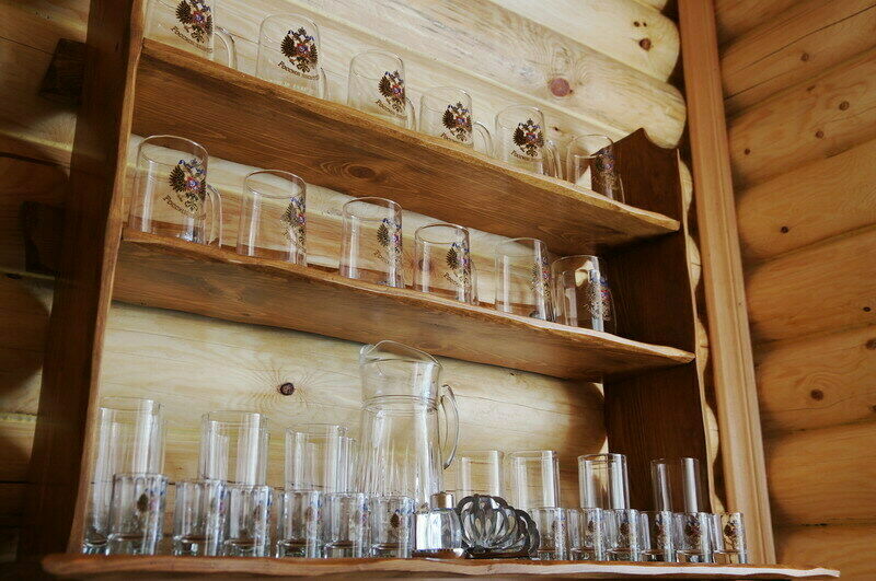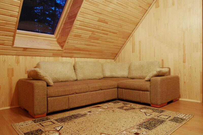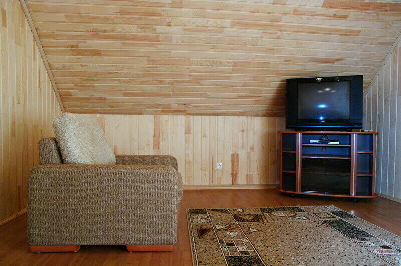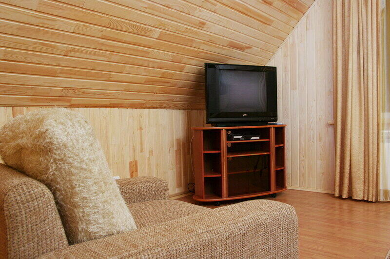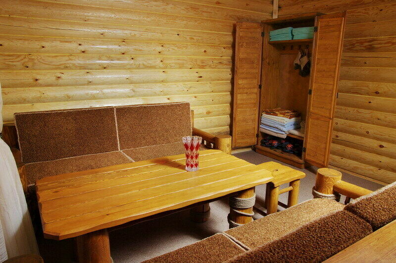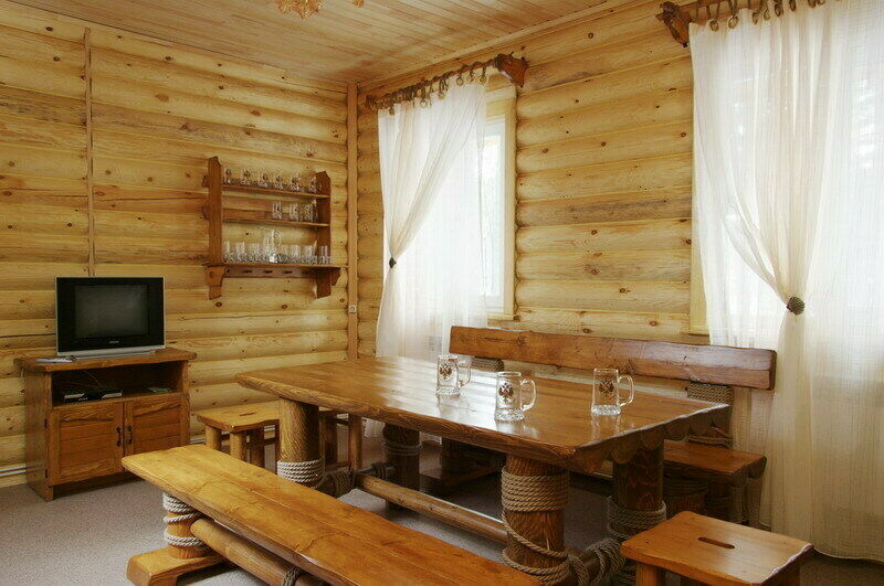 Обстановка и оборудование в Доме, как и в других коттеджах – на высшем уровне. На первом этаже оборудованная кухня и большая столовая, где есть большой стол с деревянными скамьями, легкая музыка, спутниковое телевидение и даже караоке.