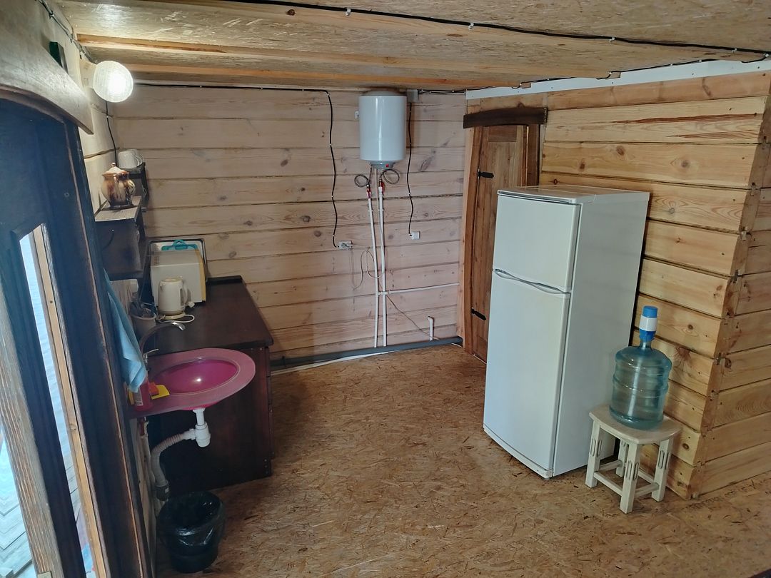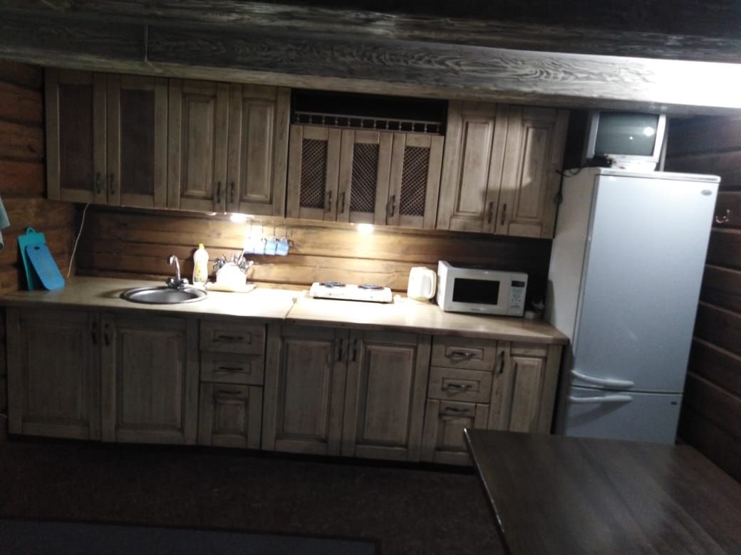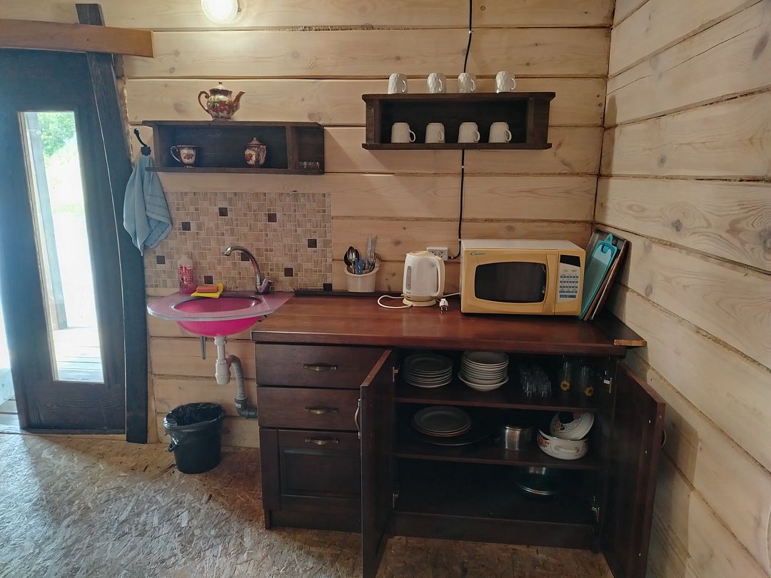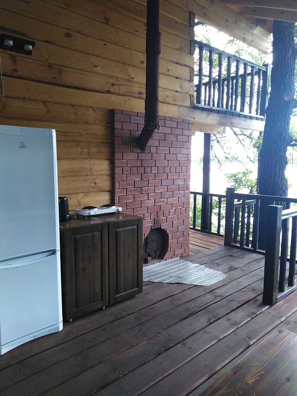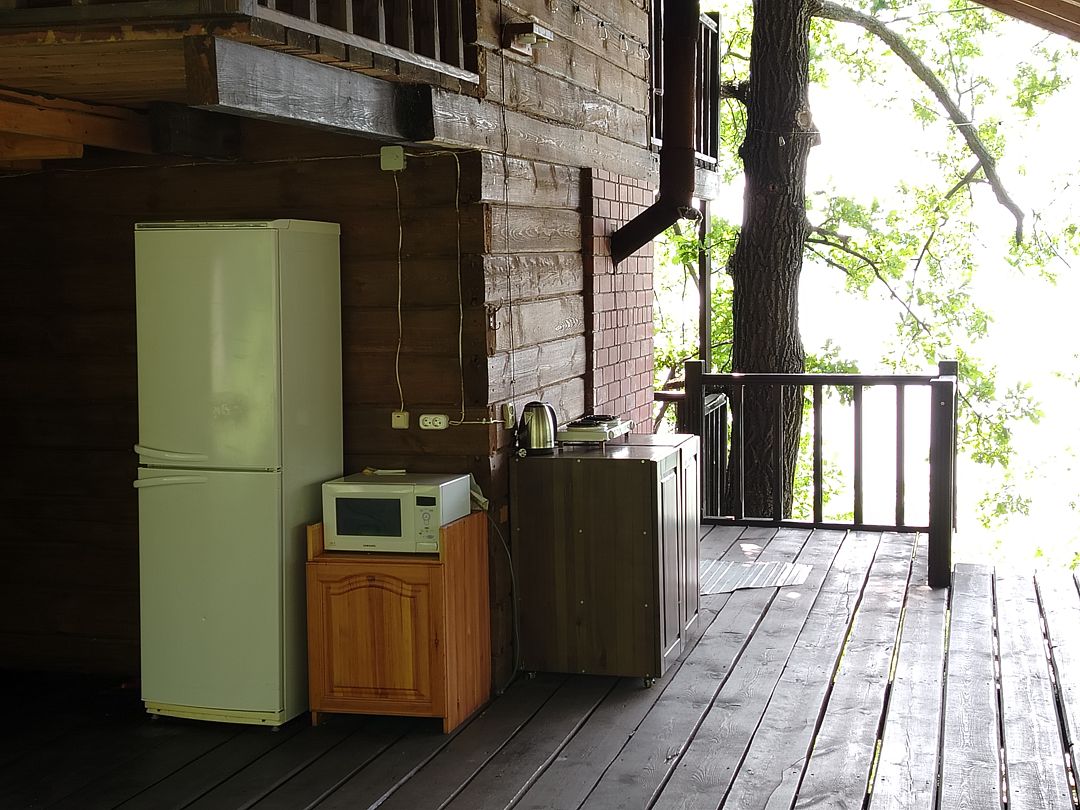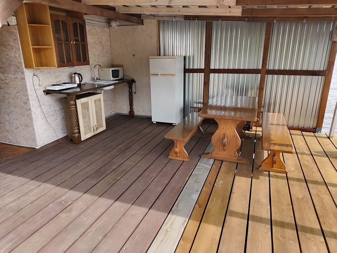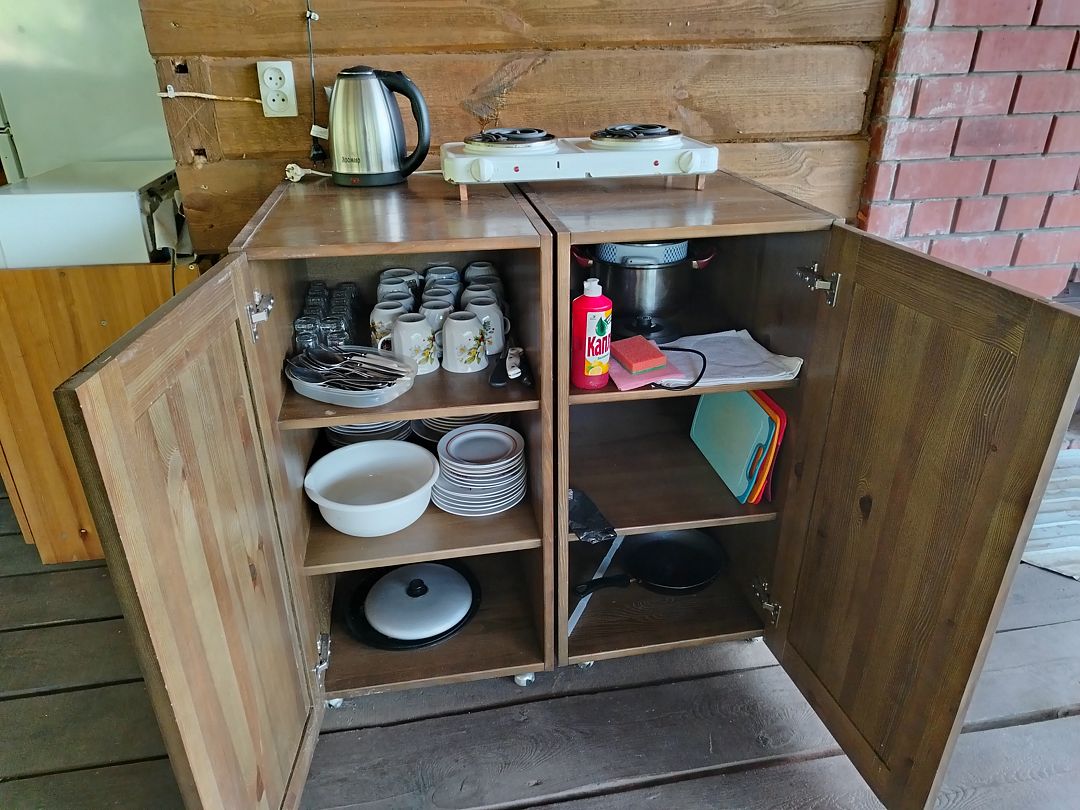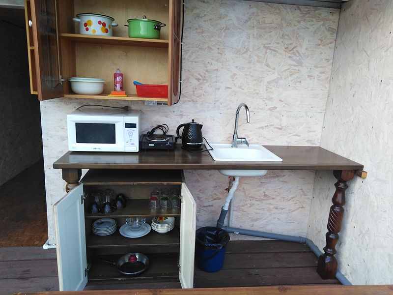 — кухня на веранде (холодильник, эл.плита, эл. чайник, микроволновка, кастрюли, сковороды , тарелки, миски, бокалы, чашки, столовые приборы и тп. входит)