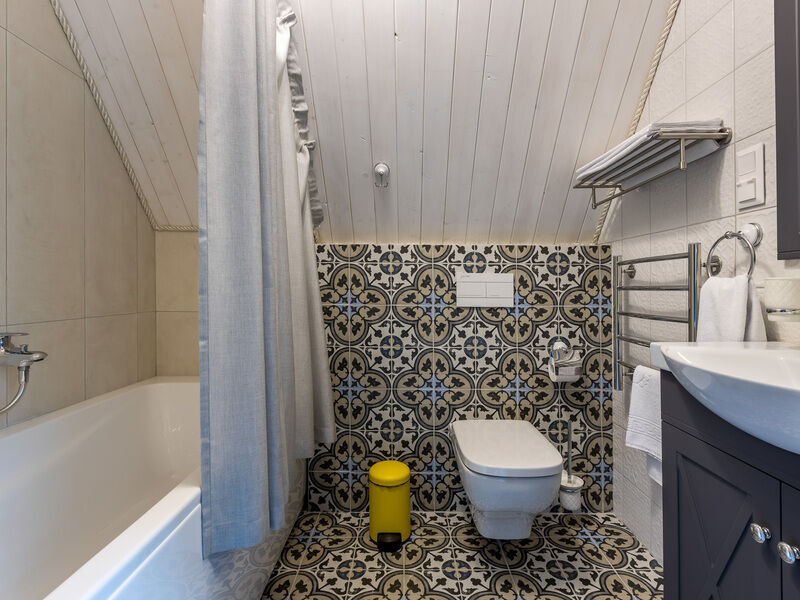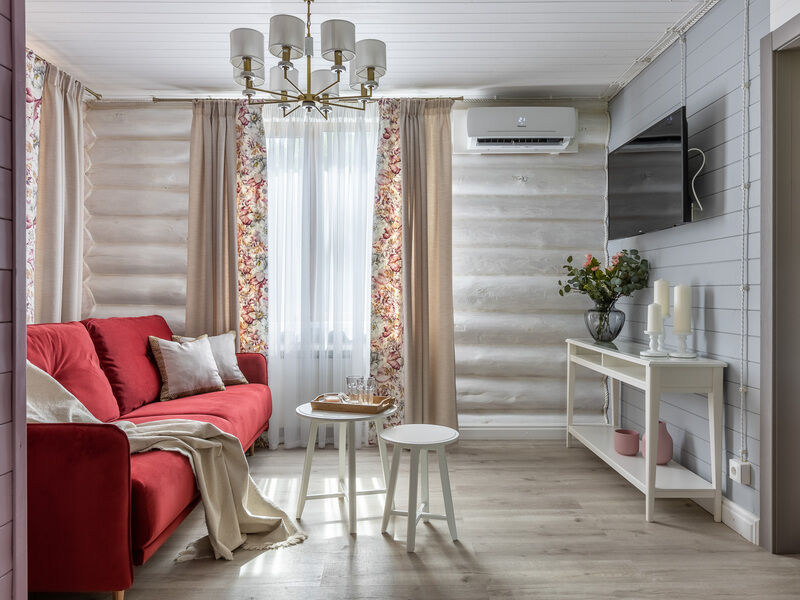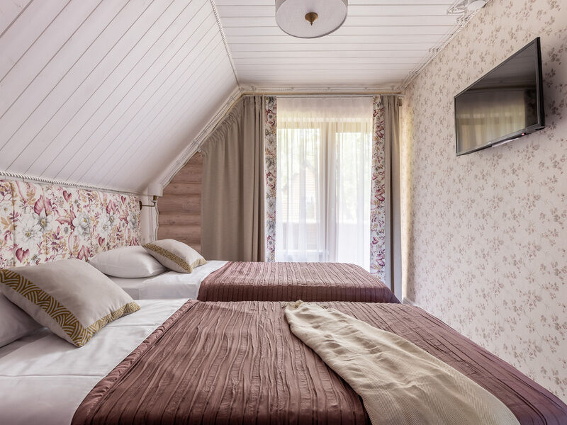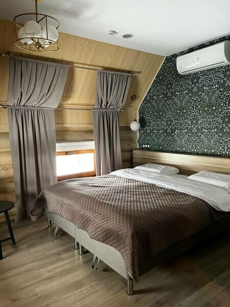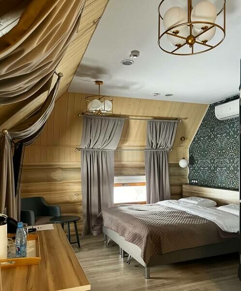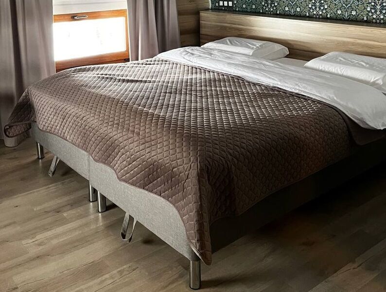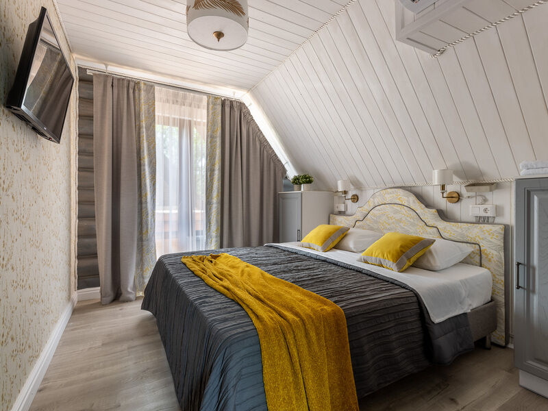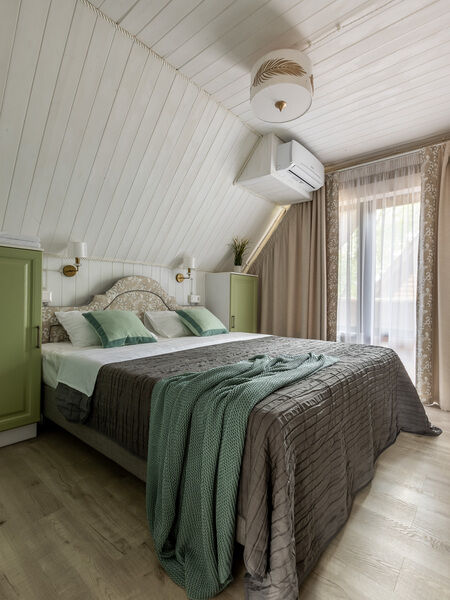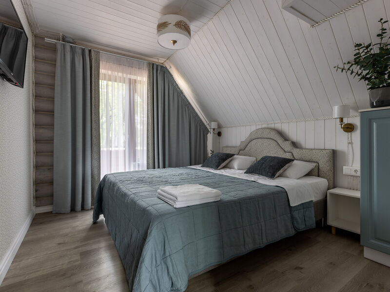В двухкомнатном номере просторная кровать с ортопедическим матрасом и 2 комплектами ортопедических и мягких подушек, кресла, стол, диван и ванная комната с душевой кабиной.