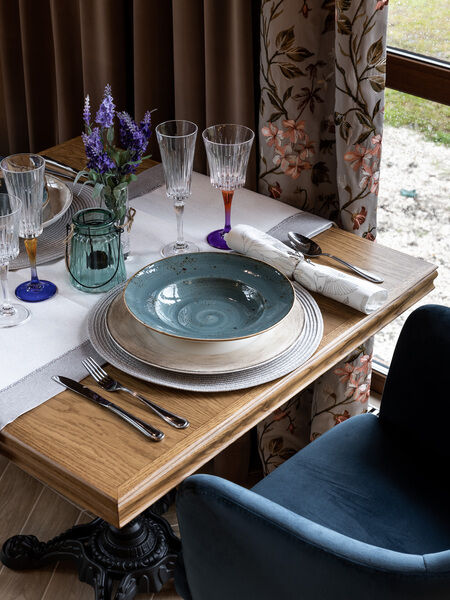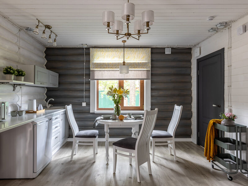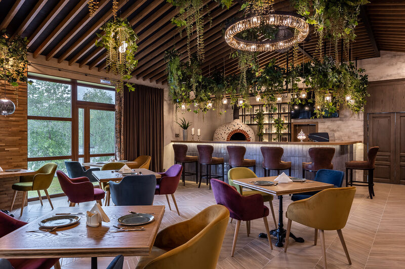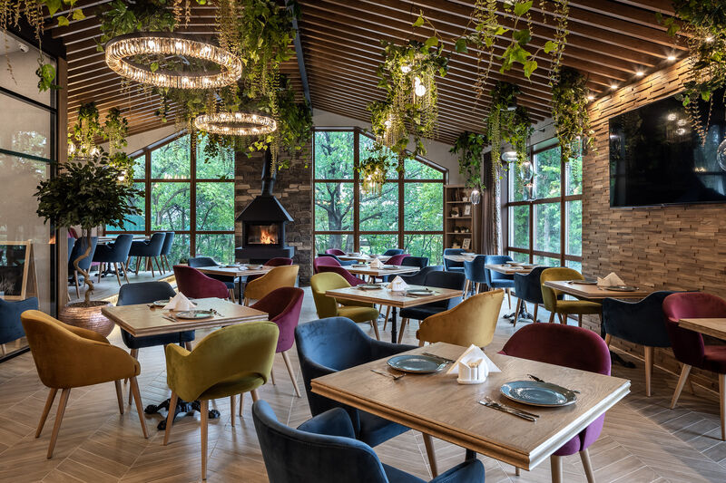 Уютный ресторан в современном стиле с панорамными окнами и видом на живописное Белое озеро.