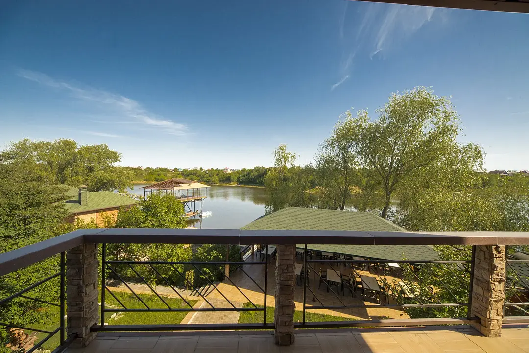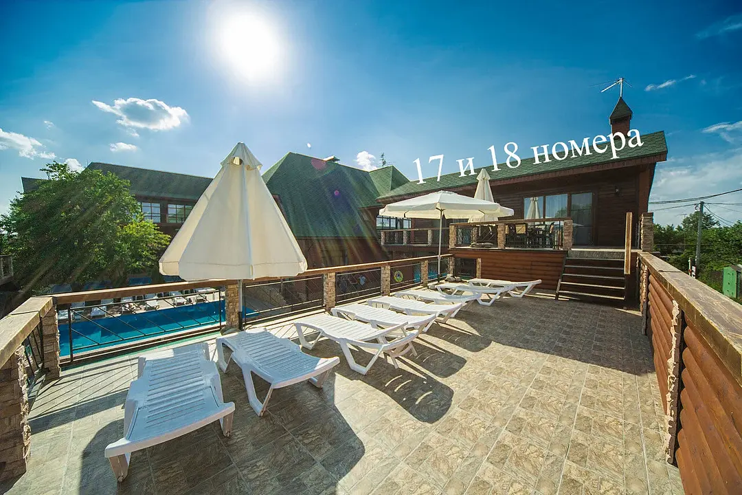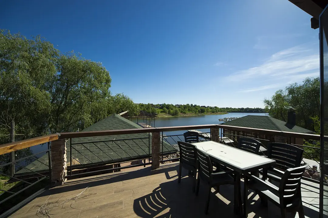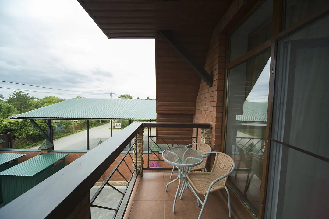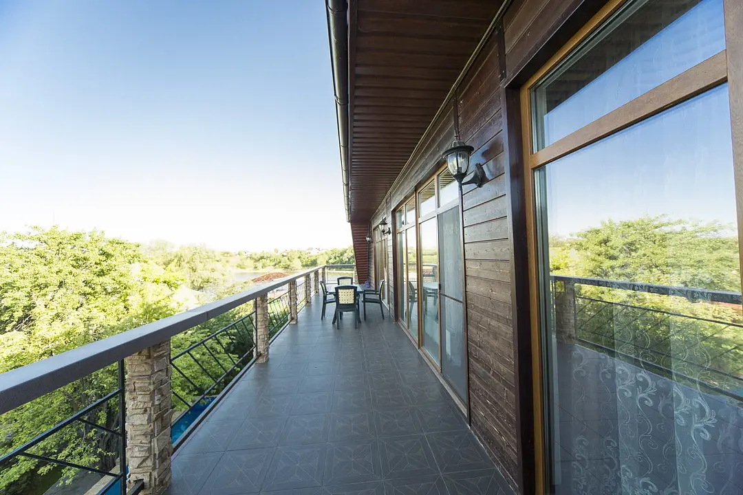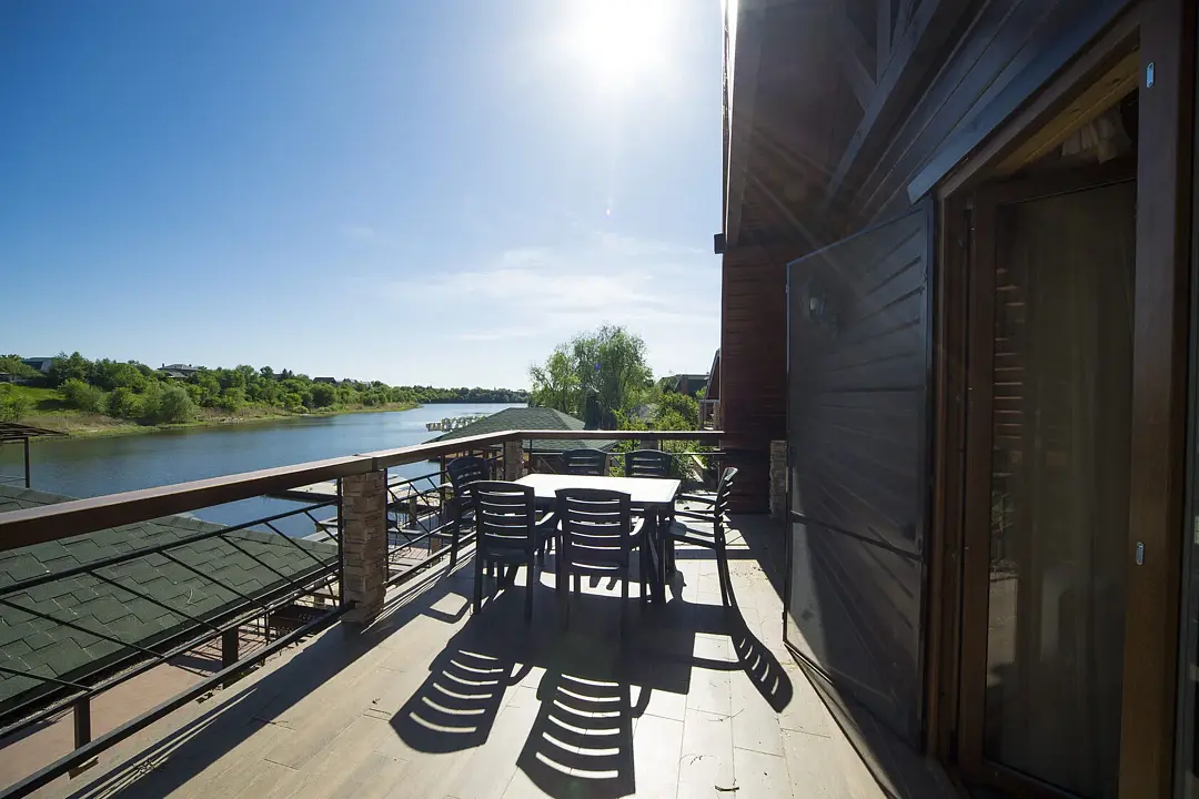 Ключевое отличие этого двухэтажного номера от других номеров (основного отеля) — это балкон-солярий с великолепным видом на реку. Один из самых любимых номеров гостей.