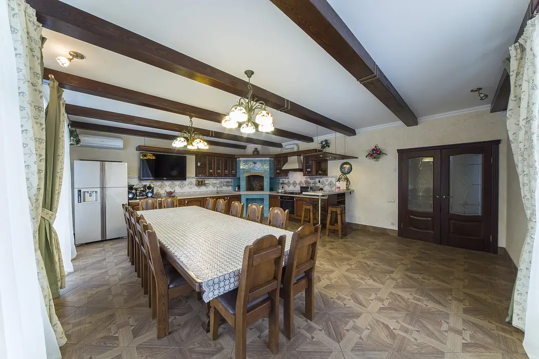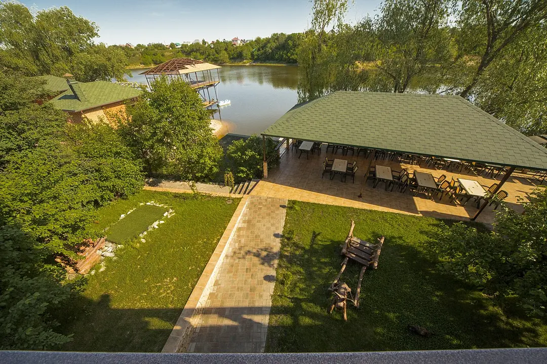 Беседка-банкетный зал. Большая, просторная беседка повышенной комфортности, площадью 50 кв. метров с панорамным видом на бассейн. Эта беседка оснащена собственной кухней, камином, мягким диваном, также в беседке есть HD-телевизор, аудиосистема, кондиционер, холодильник, душ, туалет.