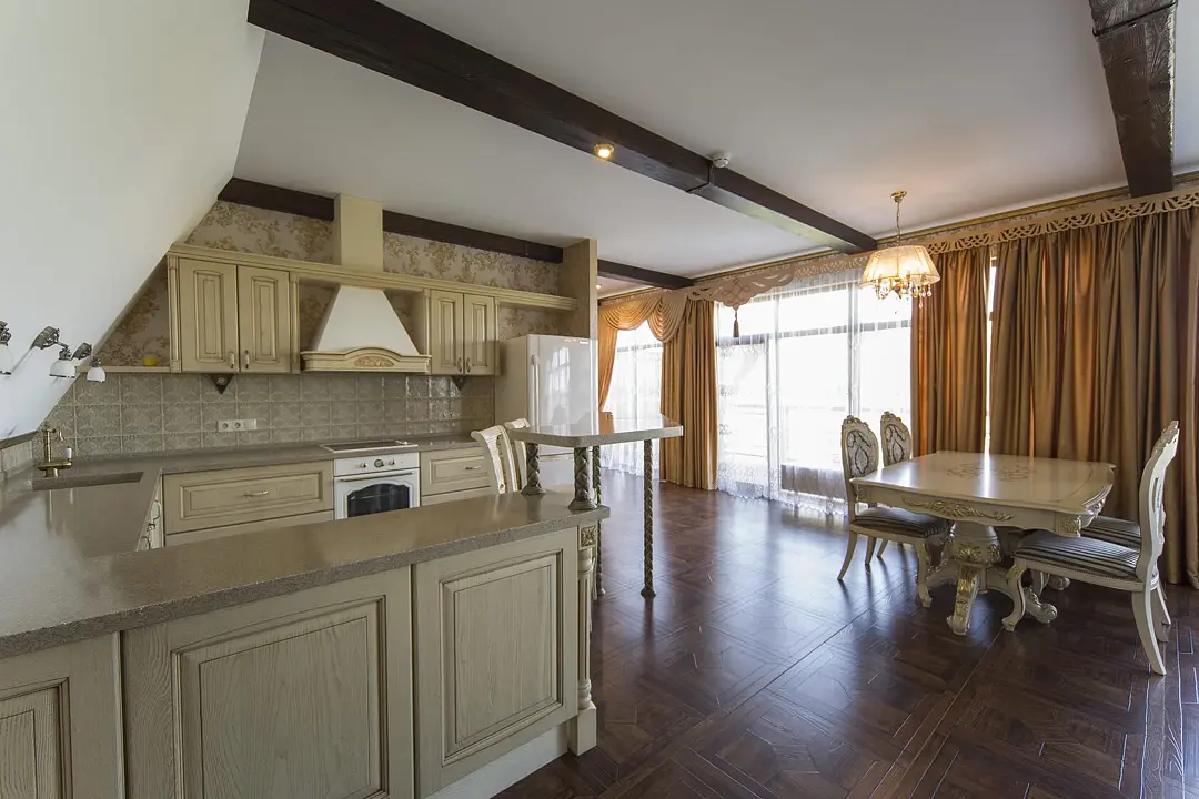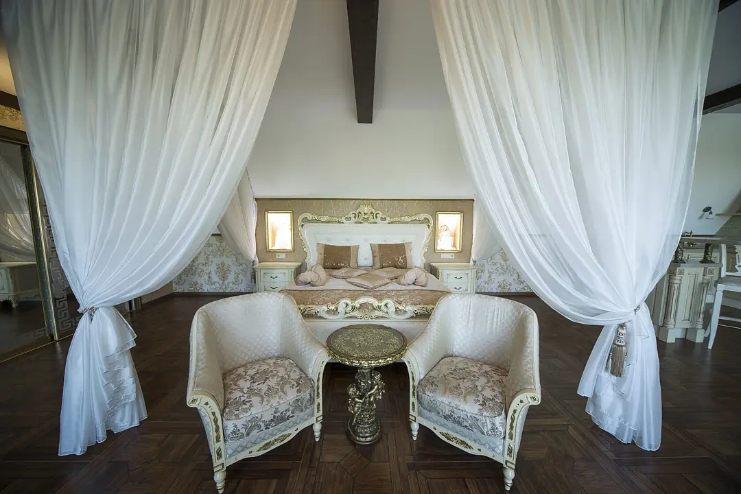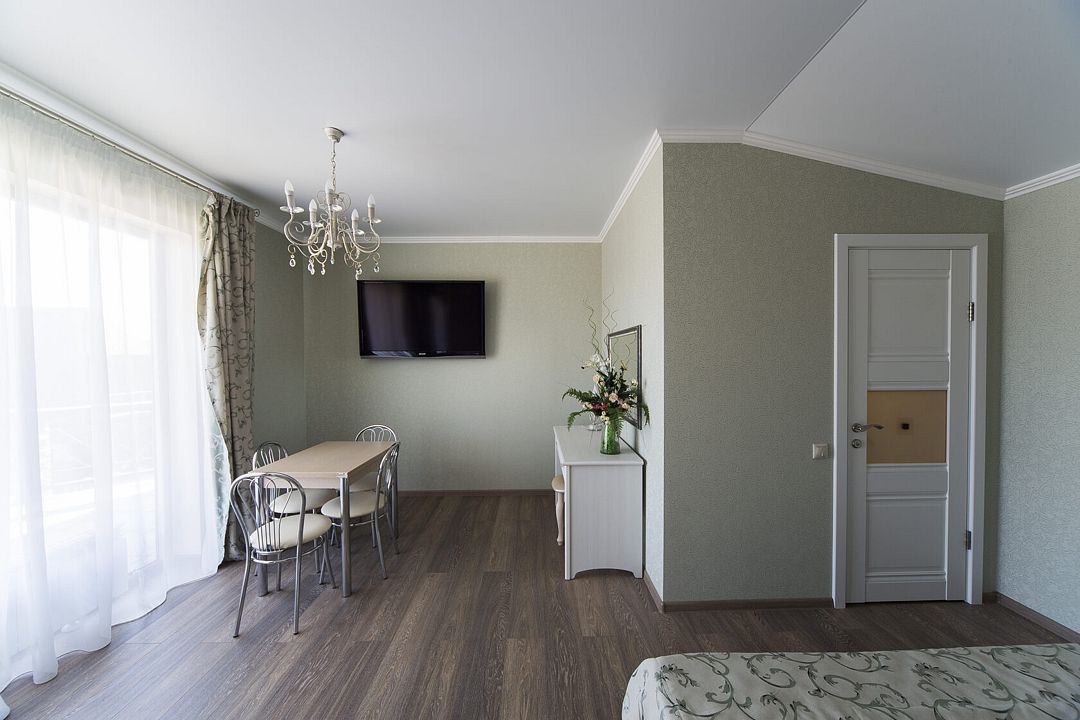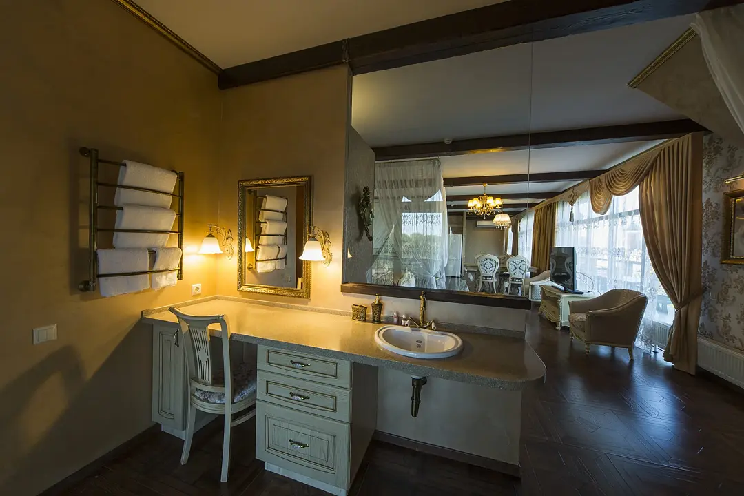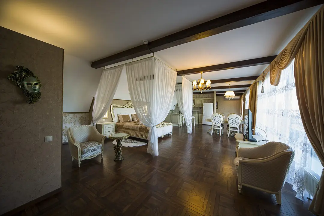 Для вашего комфортного проживания, в номере есть прихожая с зеркальным шкафом для верхней одежды, гардеробная со всем необходимым, спальня встретит вас шикарной двуспальной, поистине королевской кроватью с балдахином, а ванная — джакузи с видом на реку. Имеется обеденная зона с полностью оборудованной кухней.