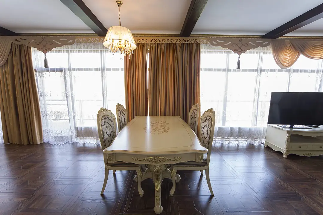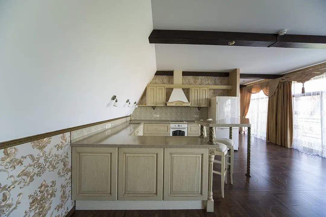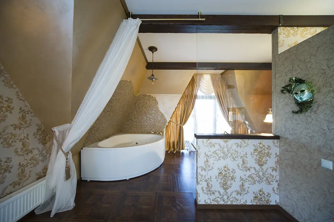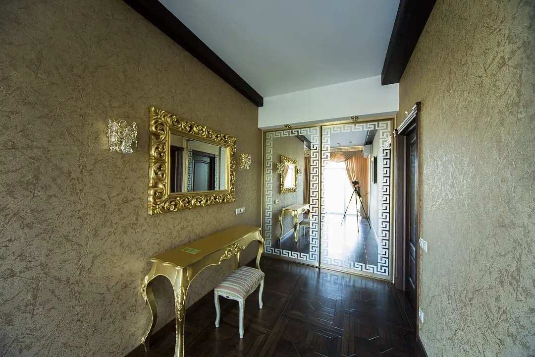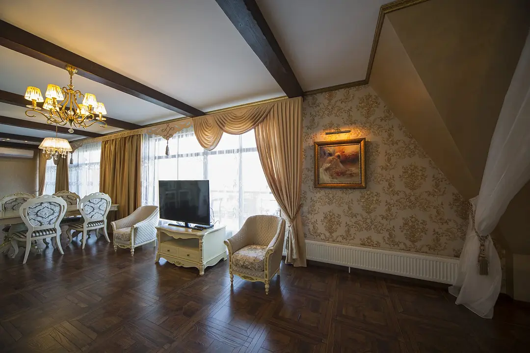 Для вашего комфортного проживания, в номере есть прихожая с зеркальным шкафом для верхней одежды, гардеробная со всем необходимым, спальня встретит вас шикарной двуспальной, поистине королевской кроватью с балдахином, а ванная — джакузи с видом на реку. Имеется обеденная зона с полностью оборудованной кухней.