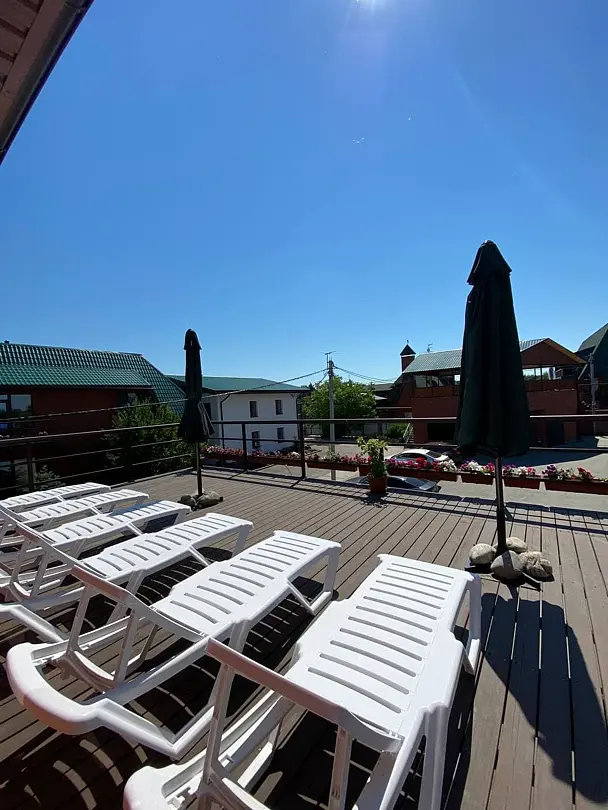 Новый номер состоит из одной двуспальной кровати и одним раскладным диваном. Также имеется выход на свою личную террасу с шезлонгами. Санузел в номере.