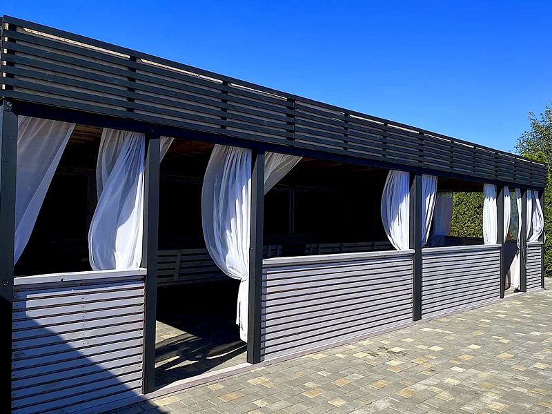 На территории также имеется много беседок от 4 до 30 человек и открытый тёплый бассейн, который работает летом и сауна.