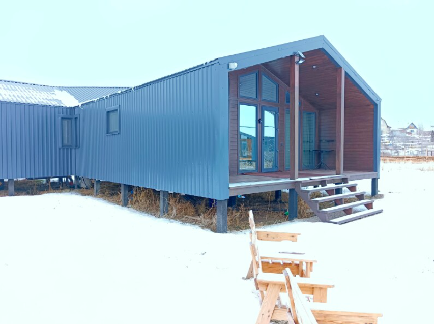Площадь дома 54 м2 с террасой. Дом состоит из 2-х комнат и индивидуального санузла.