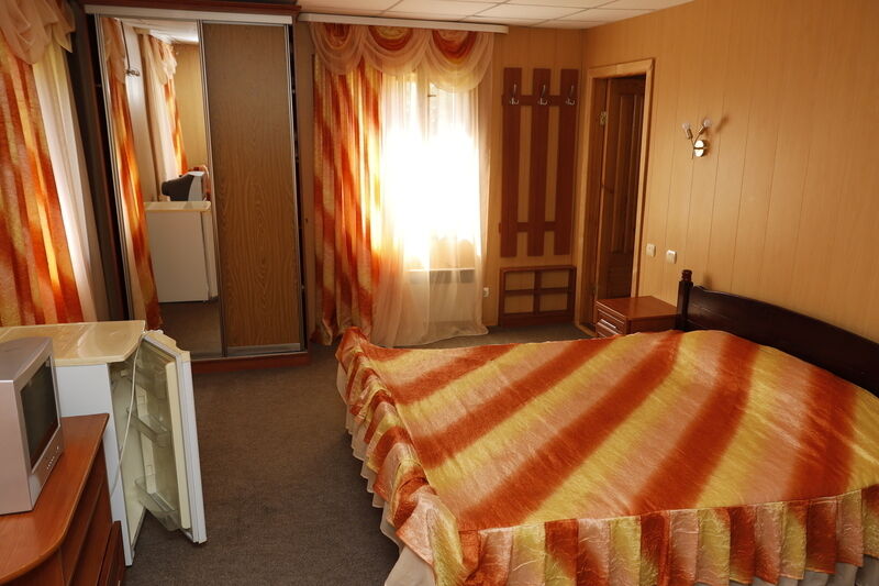 В номере: большая двухспальная кровать, шкаф-купе, журнальный столик, два кресла, холодильник, телевизор, сплит-система.
