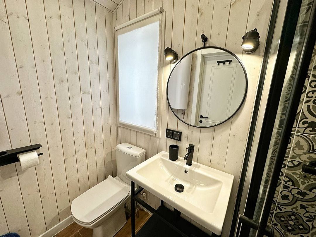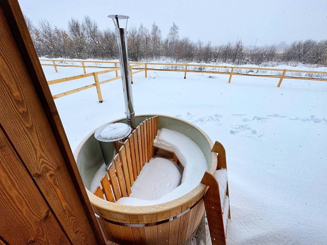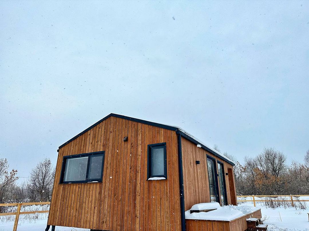 Домик располагает одной изолированной спальней с двуспальной кроватью и комфортным диваном в гостиной, что позволяет разместить до четырех человек. Санузел с душевой кабиной и феном, а также теплый пол создают максимальный комфорт.
