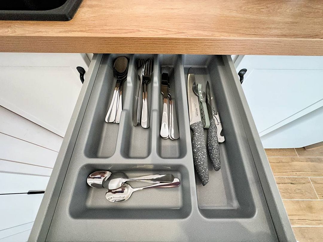Кухня, оборудованная по последнему слову техники, включает в себя микроволновую печь, электрический чайник и плиту, а также холодильник и всю необходимую посуду для приготовления и сервировки блюд.