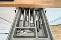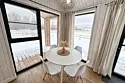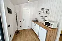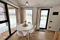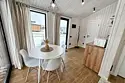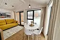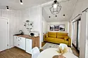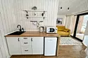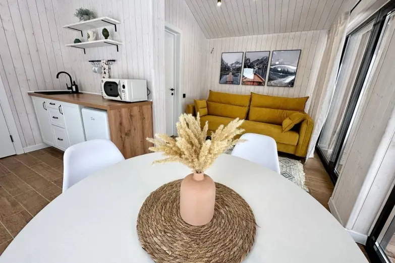Для удобства готовки предоставляется набор посуды на четырех человек, который включает тарелки, кружки для чая, бокалы, ложки, вилки и ножи. В доме располагаются четыре спальных места: спальня с двуспальной кроватью и двуспальный диван в гостиной. Санузел оборудован душевой кабиной, феном и теплым полом. Обеденная зона вмещает до четырех человек.