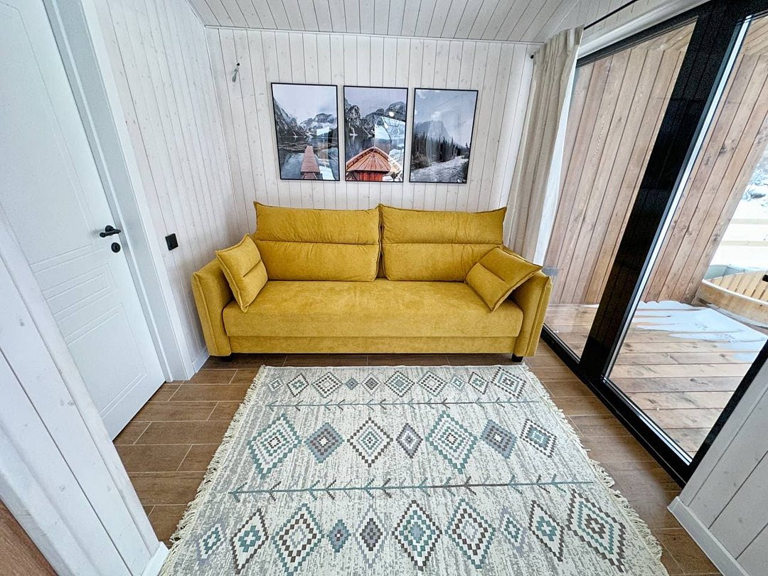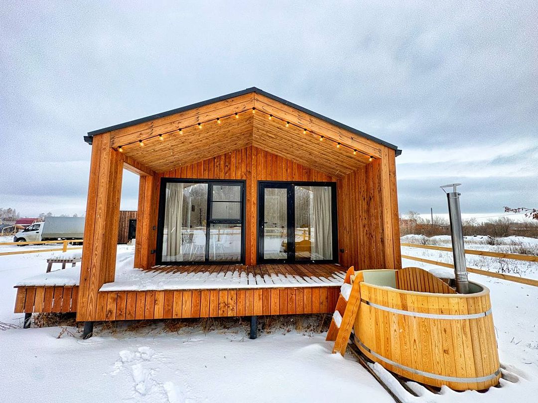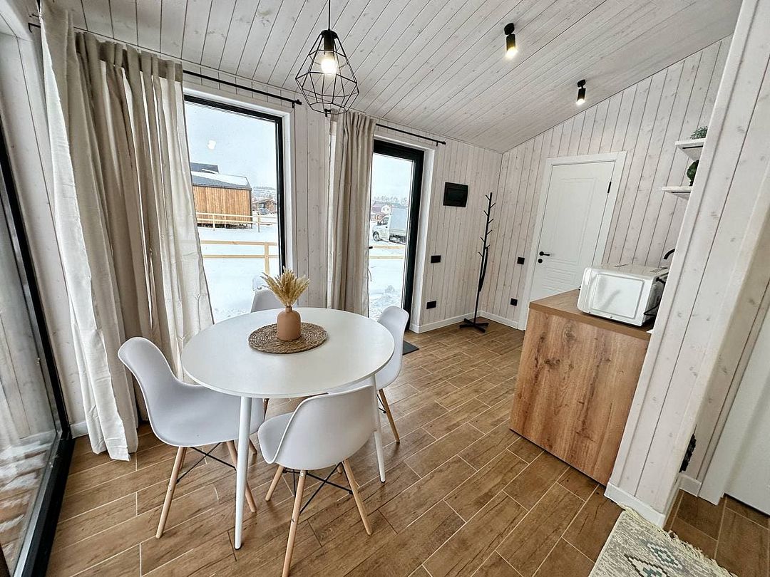 Внутри коттеджа вас ожидает уютная обстановка: просторная гостиная, спальня с удобной двуспальной кроватью, современная кухня и санузел с душем. Все это дополнено системой «Умный дом», Wi-Fi и телевизором со Smart TV, что обеспечивает все необходимое для незабываемого отдыха.
