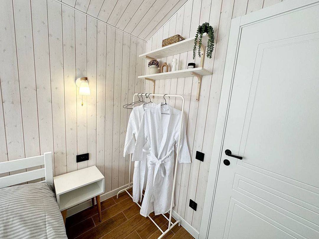 В доме одна изолированная спальня, гостиная, обеденная зона, кухня, так же санузел с душем. Имеется вся необходимая техника и посуда для вашего комфортного отдыха.